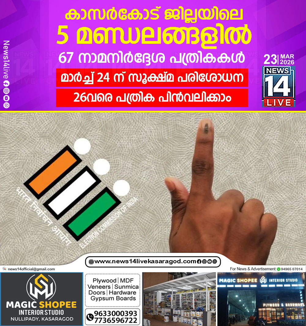 കാസർകോട് ജില്ലയിലെ 5 മണ്ഡലങ്ങളിൽ 67 നാമനിർദ്ദേശ പത്രികകൾ ; നാളെ (മാര്ച്ച് 24) സൂക്ഷ്മ പരിശോധന; 26വരെപിൻവലിക്കാംകാസർകോട്:നിയമസഭാ തിരഞ്ഞെടുപ്പിനുള്ള നാമനിര്ദേശ പത്രിക സമര്പ്പിക്കാനുള്ള സമയം പൂര്ത്തിയായപ്പോള്…
