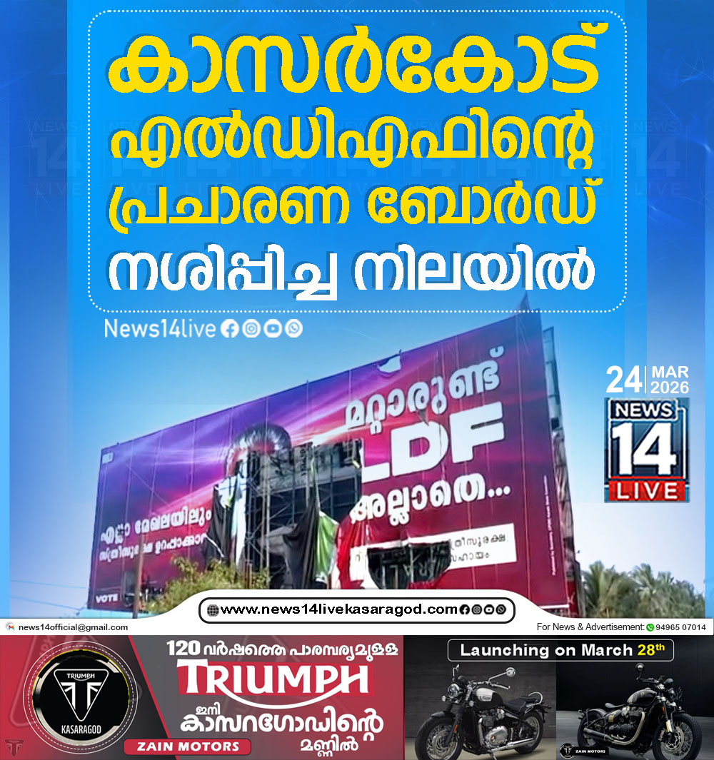 മുഖ്യമന്ത്രിയുടെ മുഖം കീറിയെടുത്തു, ദേശീയപാതക്കരികില് സ്ഥാപിച്ച LDF പ്രചാരണ ബോര്ഡ് നശിപ്പിച്ച നിലയില്