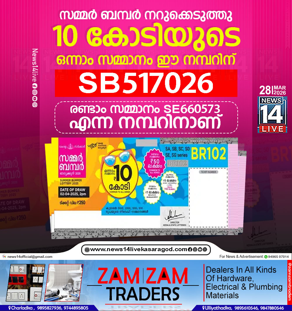 തിരുവനന്തപുരം: കേരള സര്ക്കാര് ലോട്ടറിയുടെ പത്തുകോടി രൂപ സമ്മാനത്തുകയുള്ള സമ്മര് ബമ്പര് നടുക്കെടുത്തു. പാലക്കാട് വിറ്റ ടിക്കറ്റിനാണ് ഒന്നാം സമ്മാനം. SB517026 ആണ് ടിക്കറ്റ് നമ്പര്. ജില്ലയിലെ…