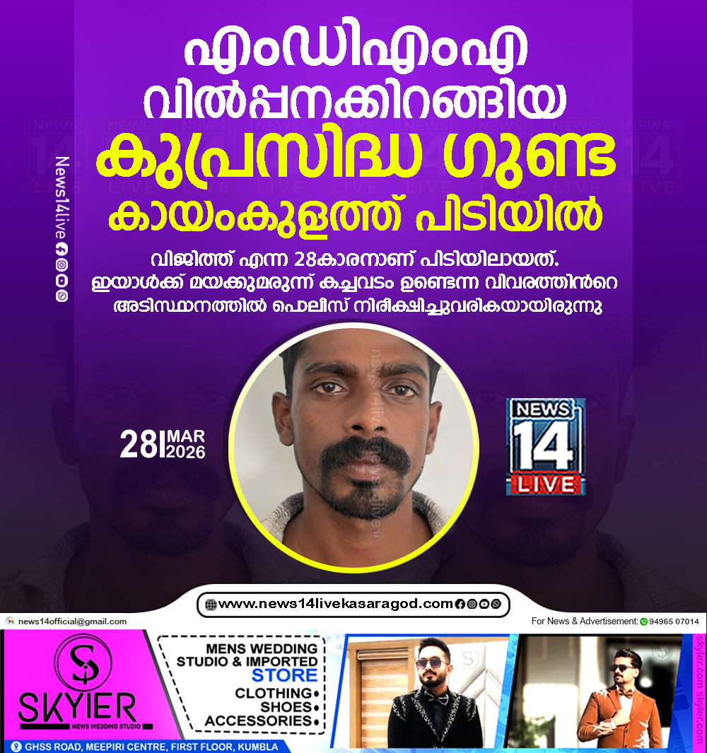 ആലപ്പുഴ: എംഡിഎംഎ വില്പ്പനയ്ക്കിറങ്ങിയ കുപ്രസിദ്ധ ഗുണ്ട കായംകുളം പൊലീസിന്റെ പിടിയില്. വിജിത്ത് എന്ന 28കാരനാണ് പിടിയിലായത്. ഇയാള്ക്ക് മയക്കുമരുന്ന് കച്ചവടം ഉണ്ടെന്ന വിവരത്തിന്റെ അടിസ്ഥാനത്തില് പൊലീസ് നിരീക്ഷിച്ചുവരികയായിരുന്നു.…