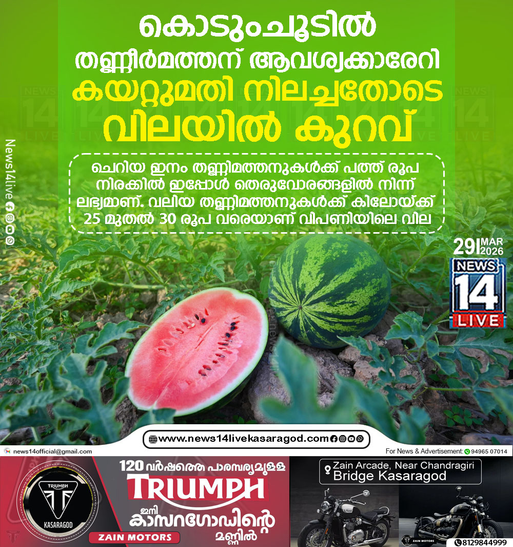 കാസർകോട്: കൊടുംചൂട് തുടരുന്ന സാഹചര്യത്തില് ദാഹമകറ്റാന് ജനങ്ങള് വലിയ തോതില് തണ്ണിമത്തനെ ആശ്രയിക്കുന്നു. തട്ടുകടകളിലും തെരുവോരങ്ങളിലും ഐസ് ചേര്ത്ത തണുപ്പിച്ച ബത്തക്ക സര്ബത്ത് കുടിക്കാന് വന് തിരക്കാണ്…