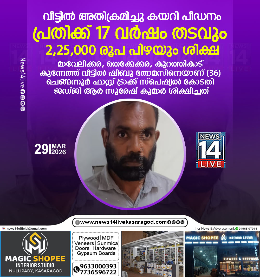 ചെങ്ങന്നൂര്: യുവതിയെ വീട്ടില് അതിക്രമിച്ചു കയറി ബലാത്സംഗം ചെയ്ത കേസില് പ്രതിക്ക് 17 വര്ഷം തടവും 2,25,000 രൂപ പിഴയും ശിക്ഷ വിധിച്ചു. മാവേലിക്കര, തെക്കേക്കര, കുറത്തികാട്…