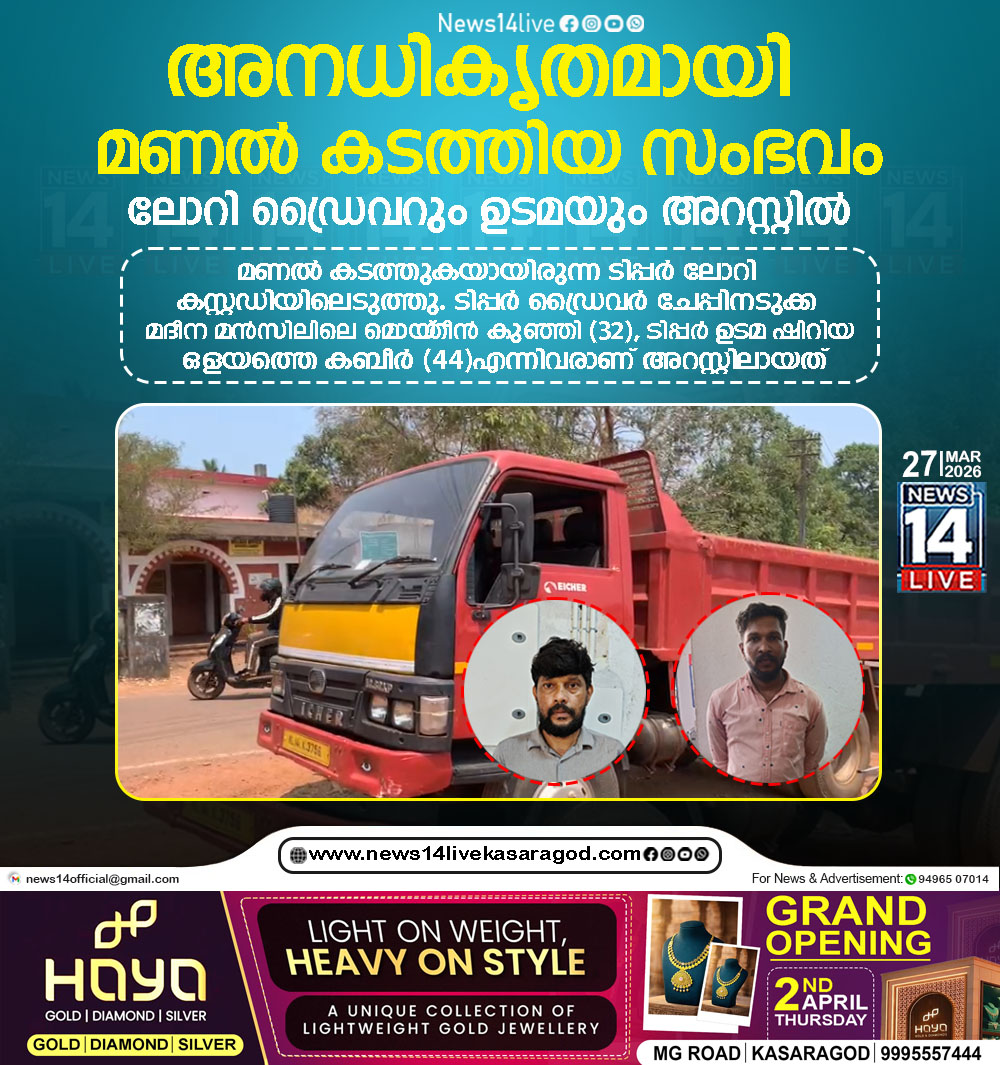 കുമ്പളയില് അനധികൃതമായി കടത്തിയ മണലും ടിപ്പര് ലോറിയുമായി ഡ്രൈവറെയും ലോറി ഉടമയെയും കുമ്പള പൊലീസ് അറസ്റ്റു ചെയ്തു. മണക്കടത്തിനു വഴിയൊരുക്കിയ ആളെ തിരഞ്ഞ് പോലീസ് കാസര്കോട്: കുമ്പളയില്…