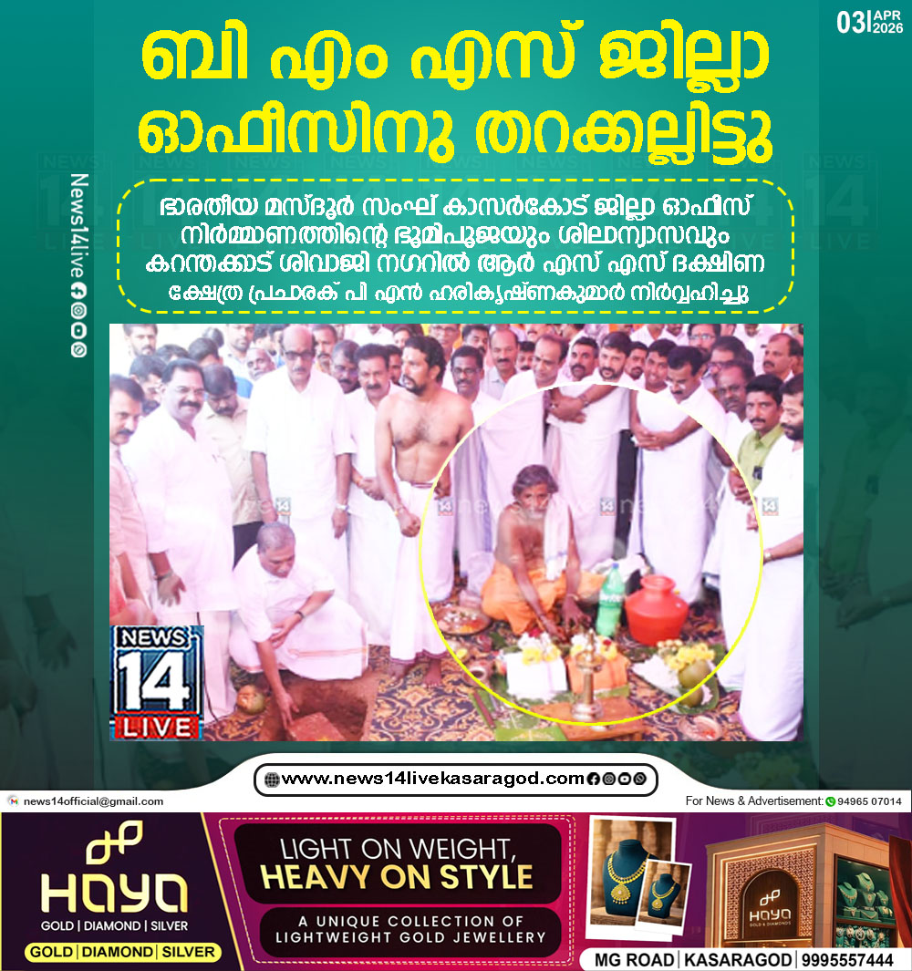 കാസര്കോട്: ഭാരതീയ മസ്ദൂര് സംഘ് കാസര്കോട് ജില്ലാ ഓഫീസ് നിര്മ്മാണത്തിന്റെ ഭൂമിപൂജയും ശിലാന്യാസവും കറന്തക്കാട് ശിവാജി നഗറില് ആര് എസ് എസ് ദക്ഷിണ ക്ഷേത്ര പ്രചാരക് പി…