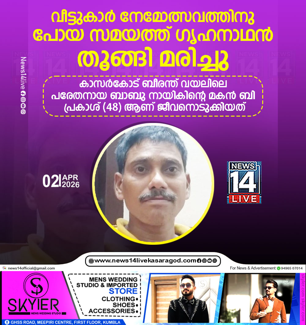 കാസര്കോട്: അമ്മയും ഭാര്യയും മകനും നേമോത്സവത്തിനു പോയ സമയത്ത് ഗൃഹനാഥന് തൂങ്ങി മരിച്ചു. കാസര്കോട് ബീരന്ത് വയലിലെ പരേതനായ ബാബു നായികിന്റെ മകന് ബി പ്രകാശ് (48)…