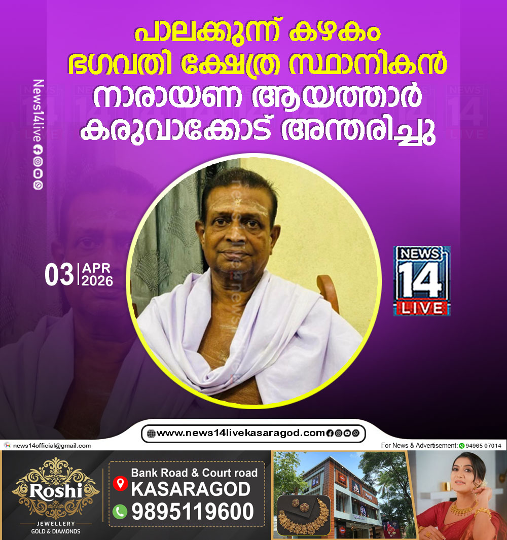 കാസര്കോട്: പാലക്കുന്ന് കഴകം ശ്രീ ഭഗവതി ക്ഷേത്ര സ്ഥാനികന് നാരായണ ആയത്താര് കരുവാക്കോട് (73) അന്തരിച്ചു. അസുഖബാധിതനായി ചികിത്സയിലായിരുന്നു. കര്ണ്ണാടക, സുബ്രഹ്മണ്യം സ്വദേശിയാണ്. 1992ല് ആണ് പനയാല്,…