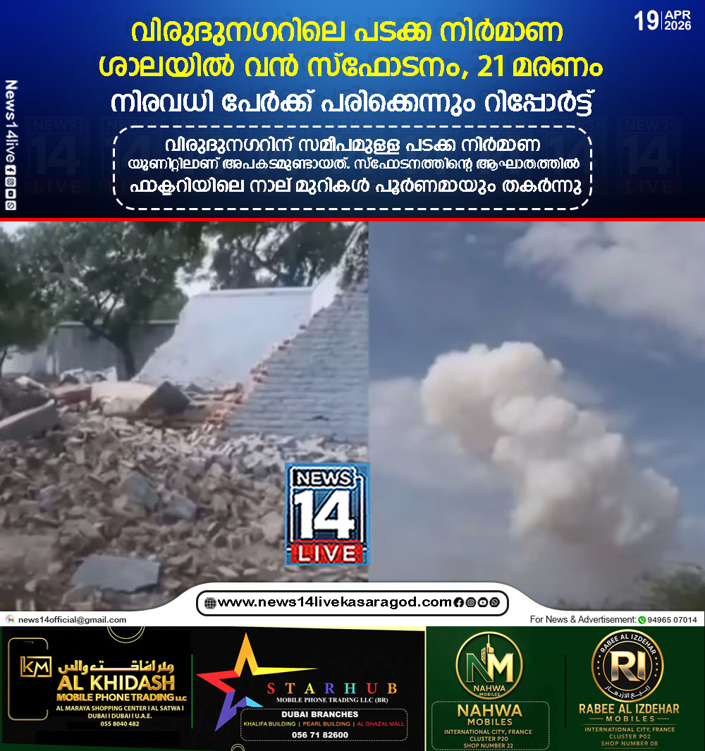 തമിഴ്നാട്ടിലെ വിരുദുനഗറില് പടക്ക നിര്മാണ ശാലയിലുണ്ടായ വന് സ്ഫോടനത്തില് 21 പേര് കൊല്ലപ്പെട്ടെന്ന് റിപ്പോര്ട്ട്. വിരുദുനഗറിന് സമീപമുള്ള പടക്ക നിര്മാണ യൂണിറ്റിലാണ് അപകടമുണ്ടായത്. സ്ഫോടനത്തിന്റെ ആഘാതത്തില് ഫാക്ടറിയിലെ…
