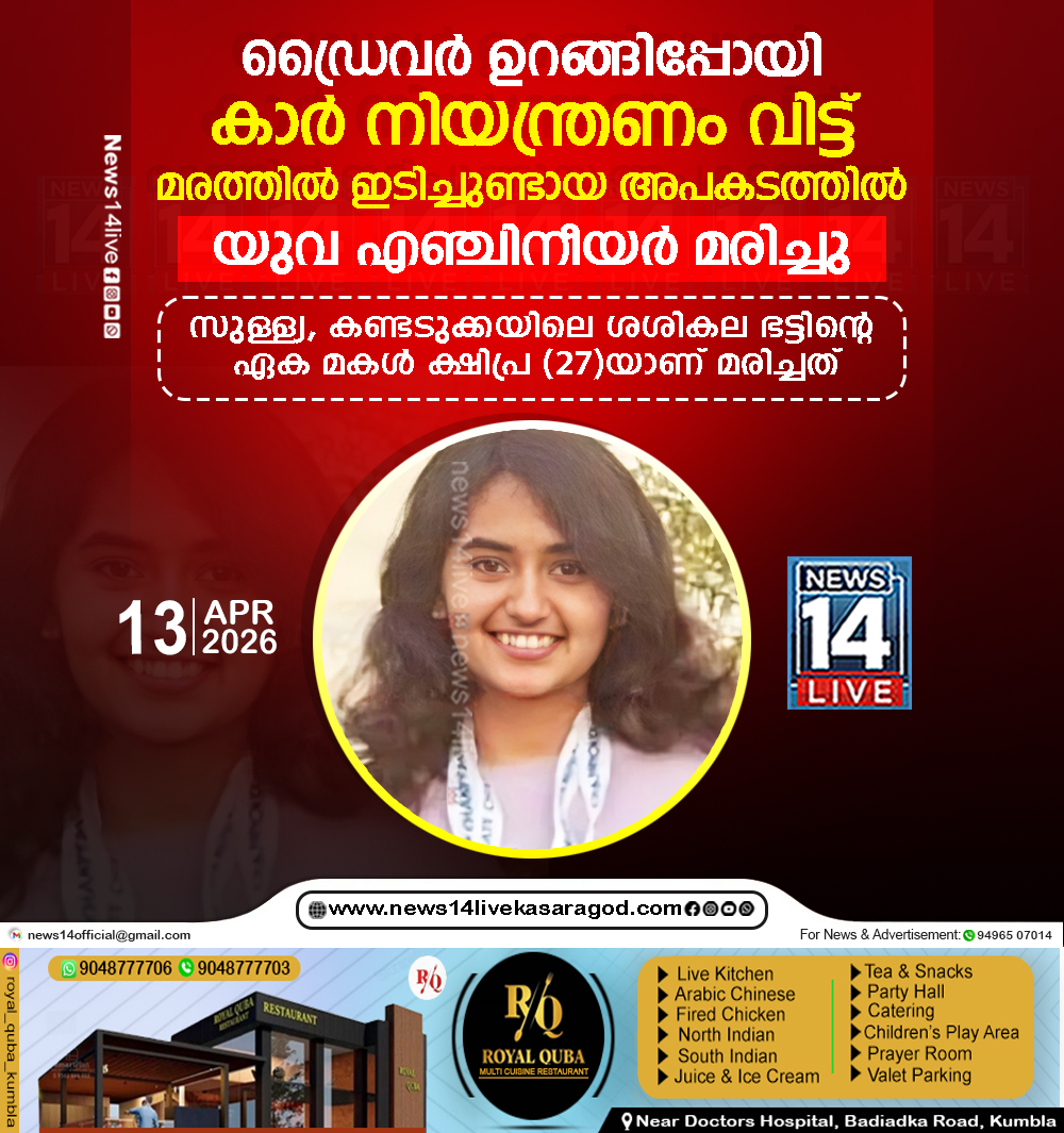 സുള്ള്യ: ഡ്രൈവര് ഉറങ്ങിപ്പോയതിനെ തുടര്ന്ന് നിയന്ത്രണം തെറ്റിയ കാര് മരത്തില് ഇടിച്ചുണ്ടായ അപകടത്തില് യുവ എഞ്ചിനീയര് മരിച്ചു. സുള്ള്യ, കണ്ടടുക്കയിലെ ശശികല ഭട്ടിന്റെ ഏക മകള് ക്ഷിപ്ര…