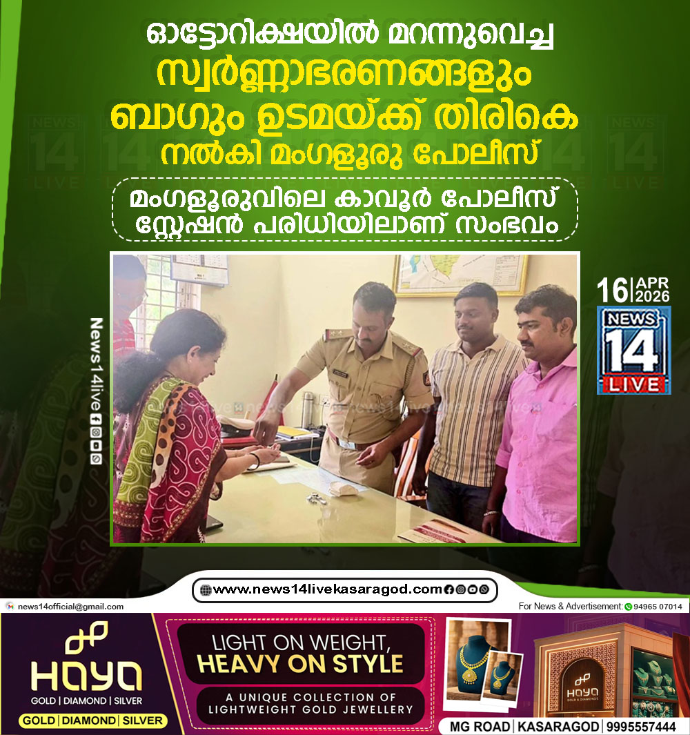മംഗളൂരു: യാത്രയ്ക്കിടെ ഓട്ടോറിക്ഷയില് മറന്നുവെച്ച വിലപിടിപ്പുള്ള സ്വര്ണ്ണാഭരണങ്ങളും ബാഗും ഉടമയ്ക്ക് സുരക്ഷിതമായി വീണ്ടെടുത്ത് നല്കി മംഗളൂരു പോലീസ് മാതൃകയായി. മംഗളൂരുവിലെ കാവൂര് പോലീസ് സ്റ്റേഷന് പരിധിയിലാണ് സംഭവം.രേഖ…
