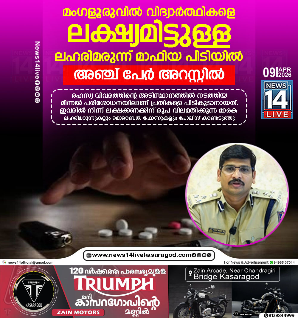 മംഗളൂരു: മംഗളൂരുവിലെ വിവിധ കോളേജ് വിദ്യാര്ത്ഥികള്ക്ക് നിരോധിത ലഹരിമരുന്നുകള് എത്തിച്ചുനല്കുന്ന പ്രധാന സംഘമാണ് സിറ്റി ക്രൈം ബ്രാഞ്ചിന്റെ (CCB) വലയിലായത്. രഹസ്യ വിവരത്തിന്റെ അടിസ്ഥാനത്തില് നടത്തിയ മിന്നല്…