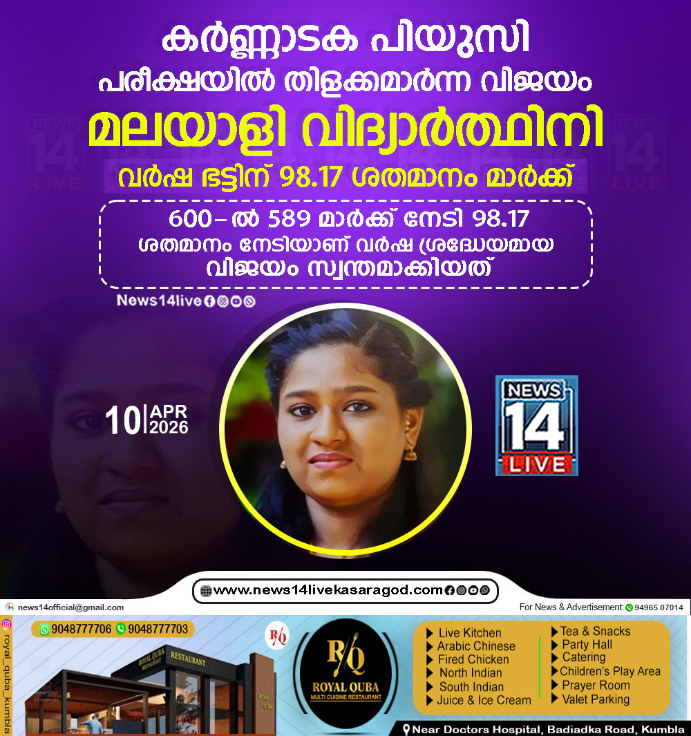കര്ണ്ണാടക പ്രീ യൂണിവേഴ്സിറ്റി (പിയുസി) കൊമേഴ്സ് പരീക്ഷയില് കാസര്കോട് സ്വദേശിനിയായ വിദ്യാര്ത്ഥിനി വര്ഷ ഭട്ടിന് ഉന്നത വിജയം. 600-ല് 589 മാര്ക്ക് നേടി 98.17 ശതമാനം നേടിയാണ്…