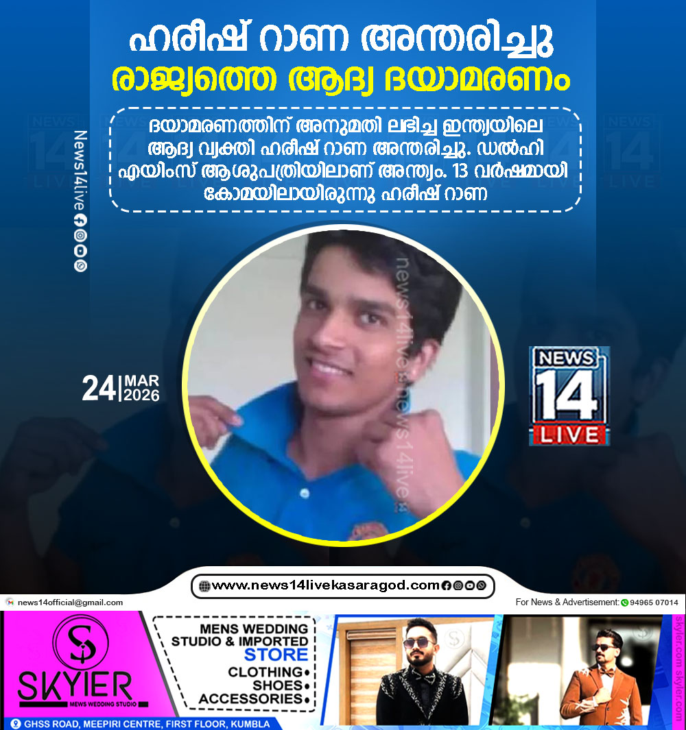 ദയാമരണത്തിന് അനുമതി ലഭിച്ച ഇന്ത്യയിലെ ആദ്യ വ്യക്തി ഹരീഷ് റാണ അന്തരിച്ചു. ഡല്ഹി എയിംസ് ആശുപത്രിയിലാണ് അന്ത്യം.13 വര്ഷമായി കോമയിലായിരുന്നു ഹരീഷ് റാണ. ദയാവധം നിയമവിധേയമാക്കിയതിന് ശേഷമുള്ള…