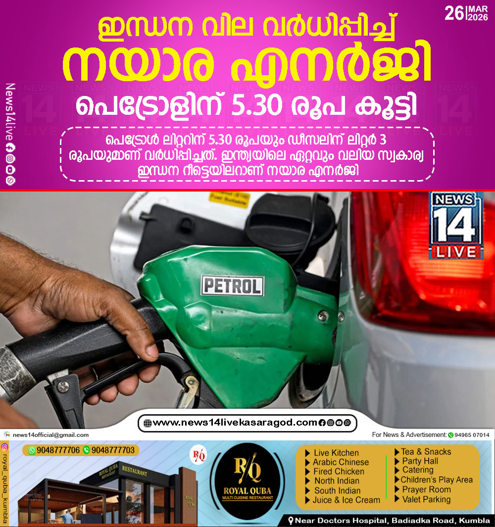 ന്യൂഡല്ഹി: ഇന്ധന വില വര്ധിപ്പിച്ച് നയാര എനര്ജി. പെട്രോള് ലിറ്ററിന് 5.30 രൂപയും ഡീസലിന് ലിറ്റര് 3 രൂപയുമാണ് വര്ധിപ്പിച്ചത്. ഇന്ത്യയിലെ ഏറ്റവും വലിയ സ്വകാര്യ ഇന്ധന…