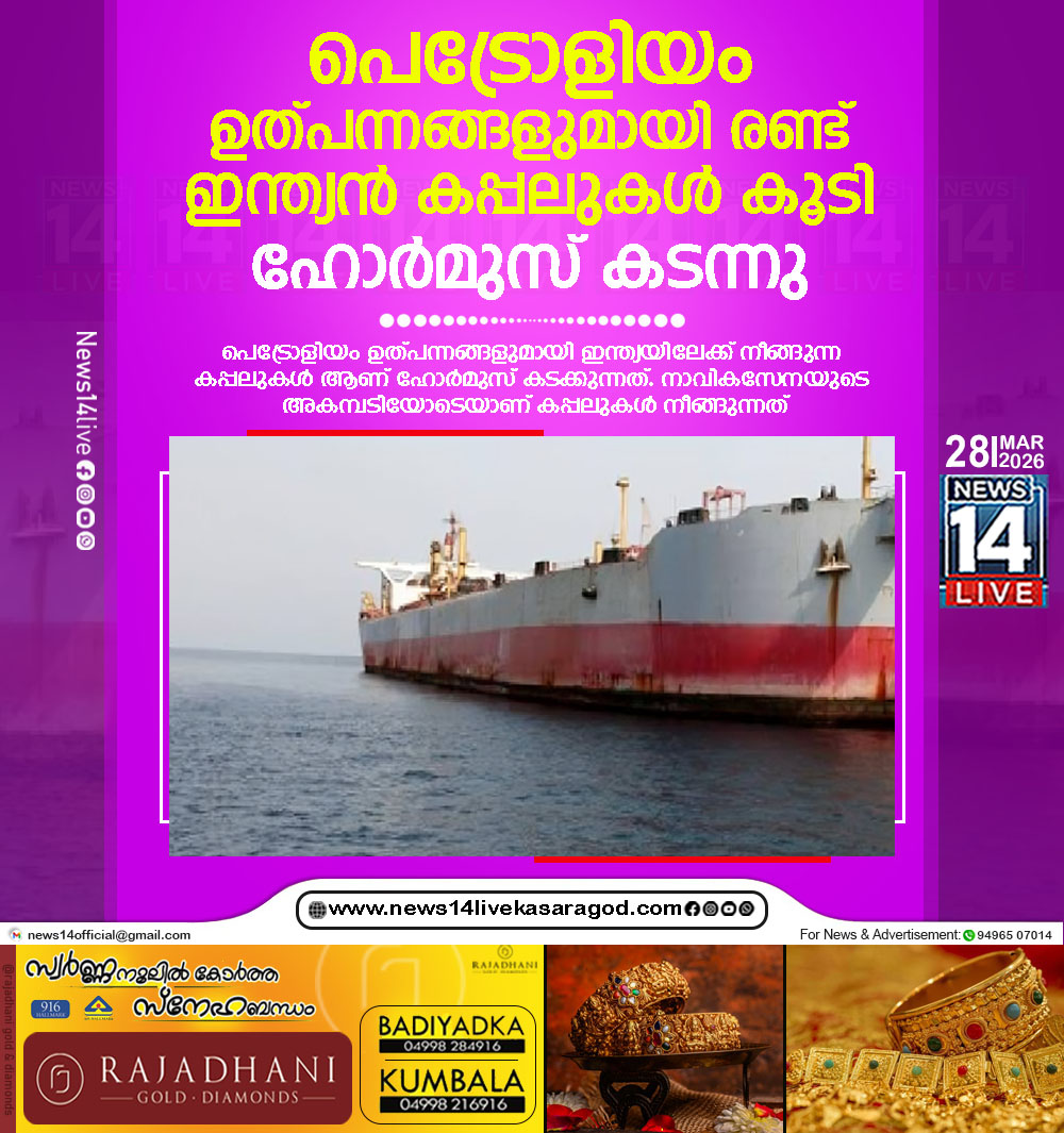 രണ്ട് ഇന്ത്യന് കപ്പലുകള് കൂടി ഹോര്മുസ് കടക്കുന്നു എന്ന് ഷിപ്പിങ് മന്ത്രാലയ വൃത്തങ്ങള്. പെട്രോളിയം ഉത്പന്നങ്ങളുമായി ഇന്ത്യയിലേക്ക് നീങ്ങുന്ന കപ്പലുകള് ആണ് ഹോര്മുസ് കടക്കുന്നത്. നാവികസേനയുടെ അകമ്പടിയോടെയാണ്…