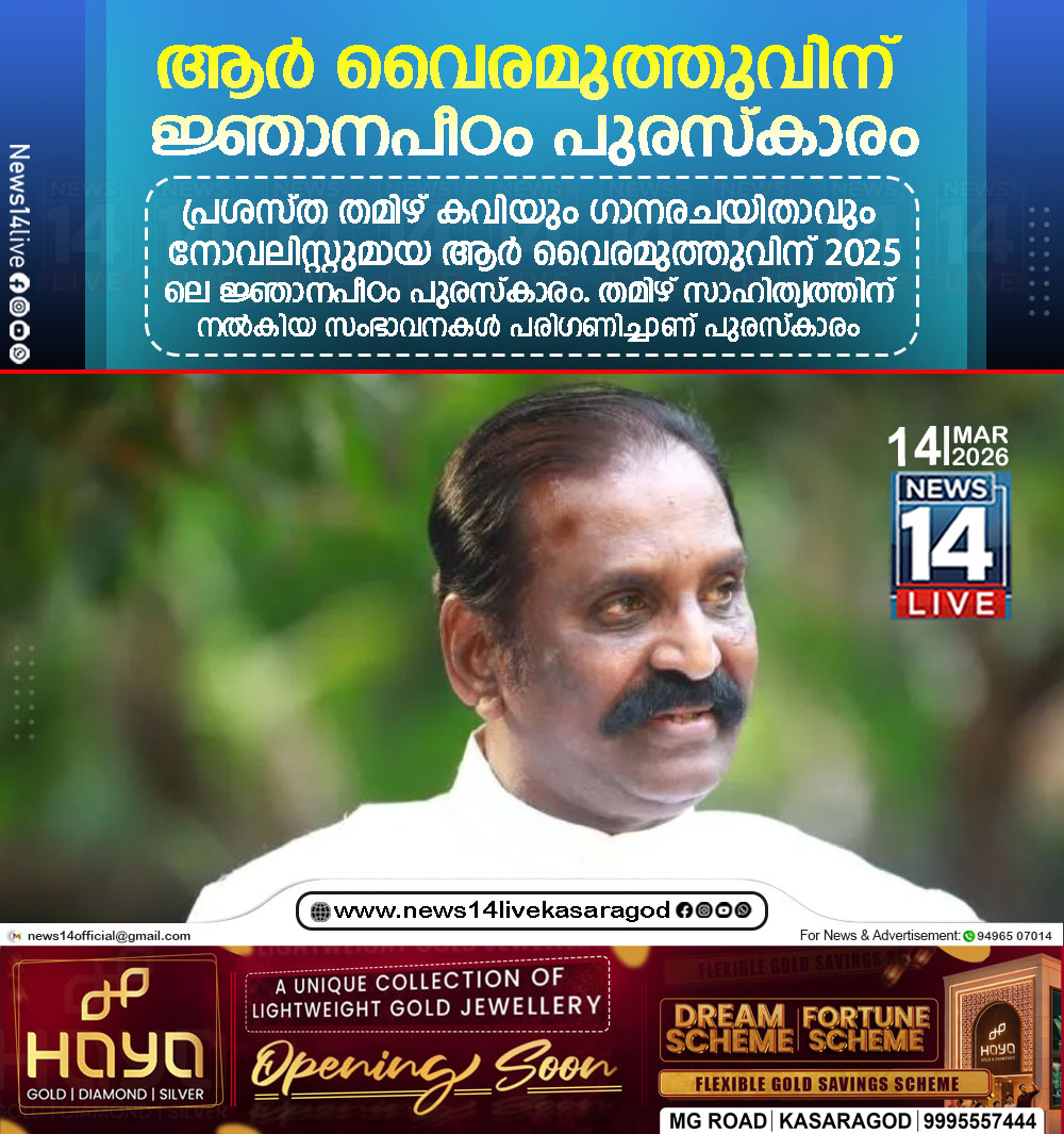 ചെന്നൈ : പ്രശസ്ത തമിഴ് കവിയും ഗാനരചയിതാവും നോവലിസ്റ്റുമായ ആര് വൈരമുത്തുവിന് 2025 ലെ ജ്ഞാനപീഠം പുരസ്കാരം. തമിഴ് സാഹിത്യത്തിന് നല്കിയ സംഭാവനകള് പരിഗണിച്ചാണ് പുരസ്കാരം. പുരസ്കാരത്തിന്…