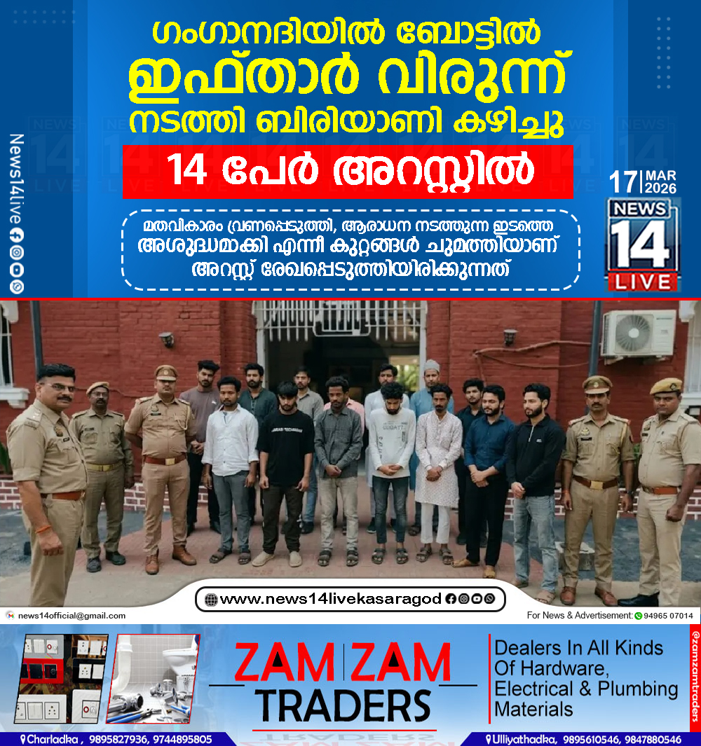 വാരണാസി: ഗംഗാനദിയില് ബോട്ടില് ഇഫ്താര് നടത്തി ബിരിയാണി കഴിച്ച 14പേരെ പൊലീസ് അറസ്റ്റ് ചെയ്തു. മതവികാരം വ്രണപ്പെടുത്തി, ആരാധന നടത്തുന്ന ഇടത്തെ അശുദ്ധമാക്കി എന്നീ കുറ്റങ്ങള് ചുമത്തിയാണ്…