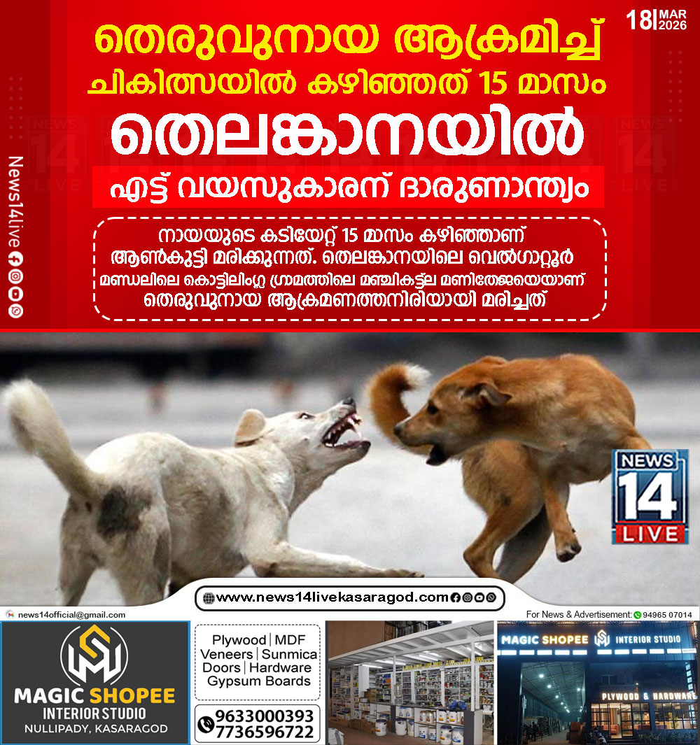 ജഗ്തിയാല്: തെരുവുനായ ആക്രമിച്ച് ചികിത്സയില് കഴിഞ്ഞത് 15 മാസം. തെലങ്കാനയില് എട്ട് വയസുകാരന് ദാരുണാന്ത്യം. നായയുടെ കടിയേറ്റ് 15 മാസം കഴിഞ്ഞാണ് ആണ്കുട്ടി മരിക്കുന്നത്. തെലങ്കാനയിലെ വെല്ഗാറ്റൂര്…