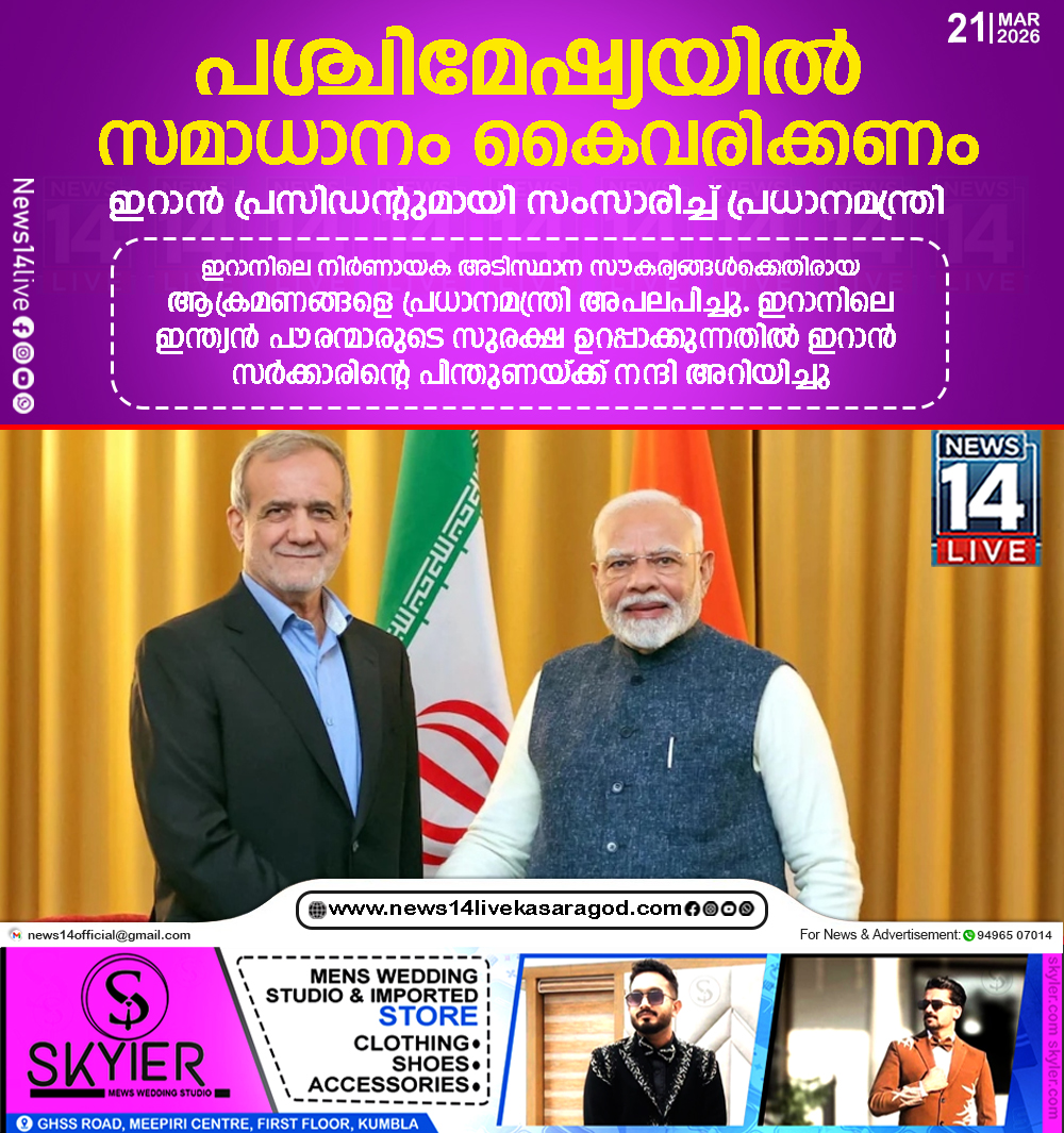 ഇറാന് പ്രസിഡന്റ് മസൂദ് പെസെഷ്കിയാനുമായി ഫോണില് സംസാരിച്ച് പ്രധാനമന്ത്രി നരേന്ദ്ര മോദി. പെരുന്നാള് – നൗറൂസ് ആശംസകള് അറിയിച്ചു. ഈ ആഘോഷവേള പശ്ചിമേഷ്യയില് സമാധാനവും സ്ഥിരതയും ഐശ്വര്യവും…