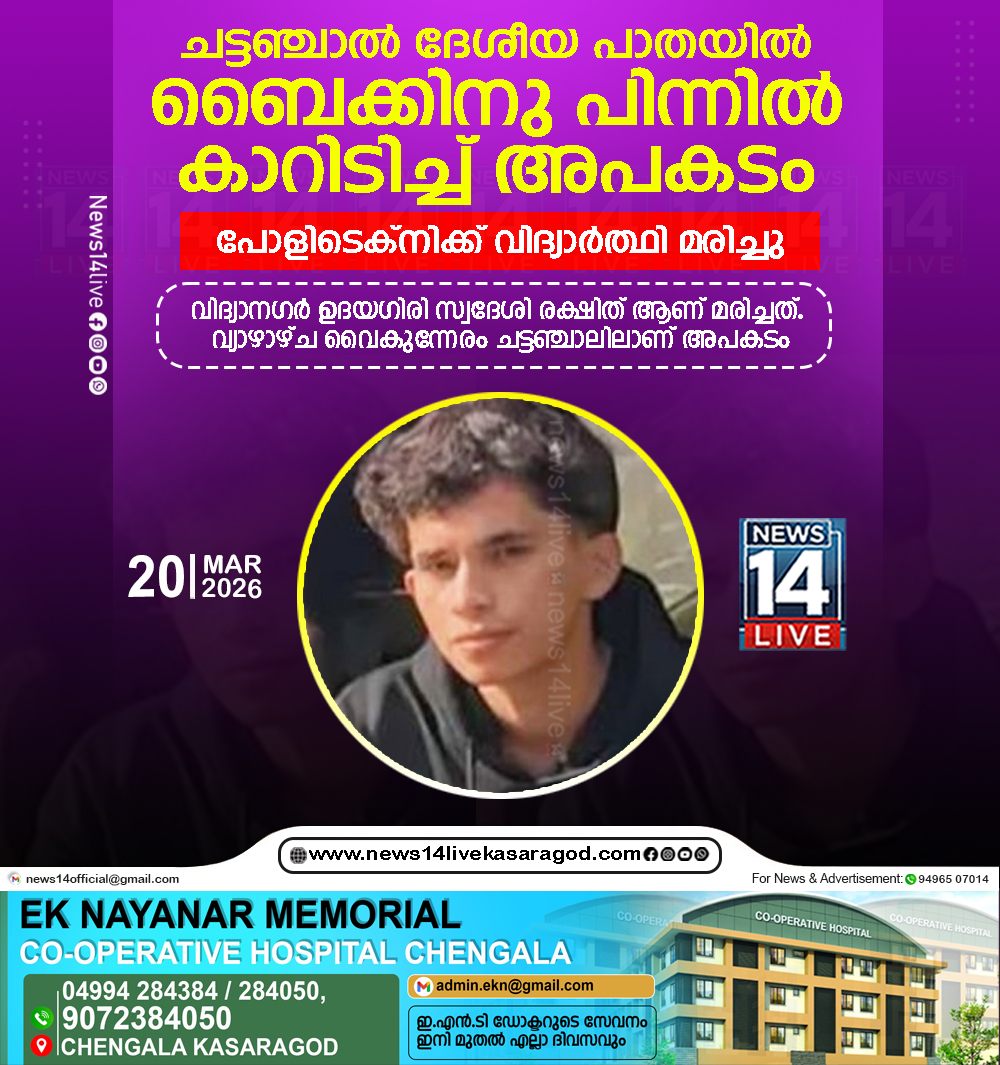 ചട്ടഞ്ചാല്‍ ദേശീയ പാതയില്‍ബൈക്കിനു പിന്നില്‍കാറിടിച്ച് അപകടം; പോളിടെക്‌നിക്ക് വിദ്യാര്‍ത്ഥി മരിച്ചു