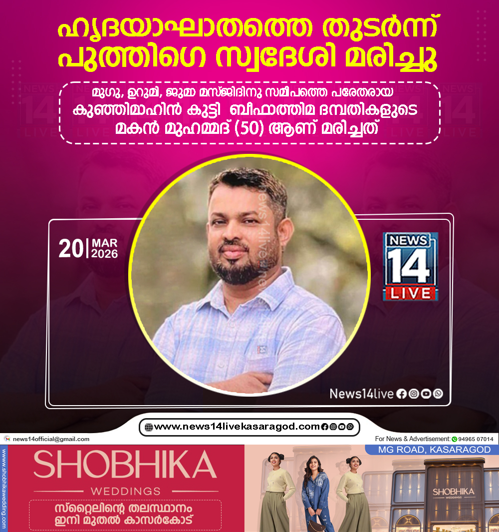 കാസര്‍കോട്: ഗൃഹപ്രവേശനത്തിനു മണിക്കൂറുകള്‍ക്ക് മുമ്പുണ്ടായ ഹൃദയാഘാതത്തെ തുടര്‍ന്ന് പുത്തിഗെ സ്വദേശി മരിച്ചു. മുഗു, ഉറുമി, ജുമാ മസ്ജിദിനു സമീപത്തെ പരേതരായ കുഞ്ഞിമാഹിന്‍ കുട്ടി – ബീഫാത്തിമ ദമ്പതികളുടെ…