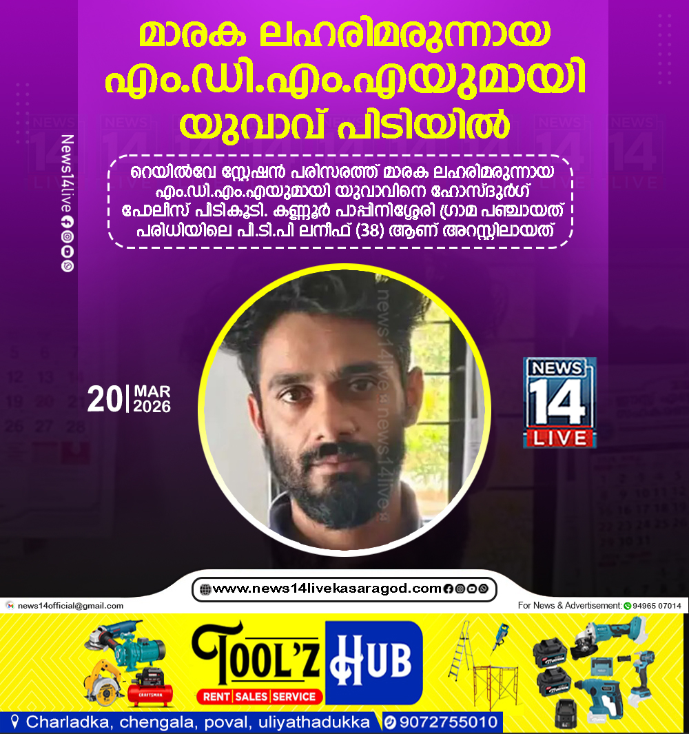 കാഞ്ഞങ്ങാട് റെയില്‍വേ സ്റ്റേഷന്‍ പരിസരത്ത് മാരക ലഹരിമരുന്നായ എം.ഡി.എം.എയുമായി യുവാവിനെ ഹോസ്ദുര്‍ഗ് പോലീസ് പിടികൂടി. കണ്ണൂര്‍ പാപ്പിനിശ്ശേരി ഗ്രാമ പഞ്ചായത് പരിധിയിലെ പി.ടി.പി ലനീഫ് (38) ആണ്…