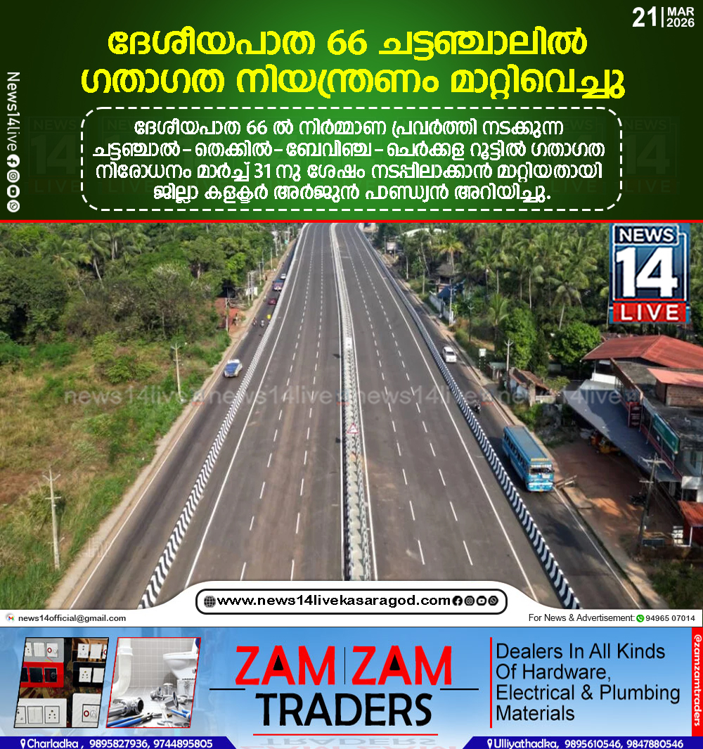 ദേശീയപാത 66 ല്‍ നിര്‍മ്മാണ പ്രവര്‍ത്തി നടക്കുന്ന ചട്ടഞ്ചാല്‍-തെക്കില്‍-ബേവിഞ്ച-ചെര്‍ക്കള റൂട്ടില്‍ ഗതാഗത നിരോധനം മാര്‍ച്ച് 31 നു ശേഷം നടപ്പിലാക്കാന്‍ മാറ്റിയതായി ജില്ലാ കളക്ടര്‍ അര്‍ജുന്‍ പാണ്ഡ്യന്‍…