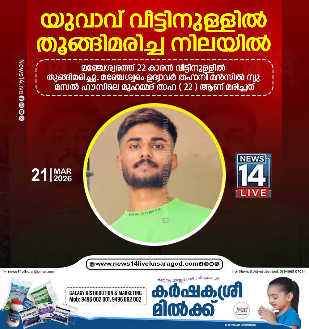 മഞ്ചേശ്വരം: മഞ്ചേശ്വരത്ത് 22 കാരന്‍ വീട്ടിനുള്ളില്‍ തൂങ്ങിമരിച്ചു. മഞ്ചേശ്വരം ഉദ്യാവര്‍ തഹാനി മന്‍സില്‍ ന്യൂ മസല്‍ ഹൗസിലെ മുഹമ്മദ് താഹ ( 22 ) ആണ് വീട്ടിനുള്ളില്‍…