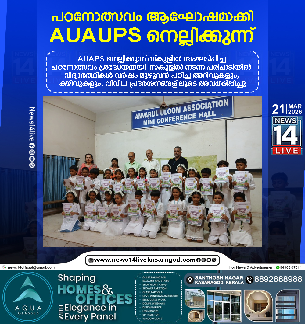 കാസര്‍ഗോസ് : AUAPS നെല്ലിക്കുന്ന് സ്‌കൂളില്‍ സംഘടിപ്പിച്ച പഠനോത്സവം ശ്രദ്ധേയമായി. സ്‌കൂളില്‍ നടന്ന പരിപാടിയില്‍ വിദ്യാര്‍ത്ഥികള്‍ വര്‍ഷം മുഴുവന്‍ പഠിച്ച അറിവുകളും, കഴിവുകളും, വിവിധ പ്രദര്‍ശനങ്ങളിലൂടെ അവതരിപ്പിച്ചു.…