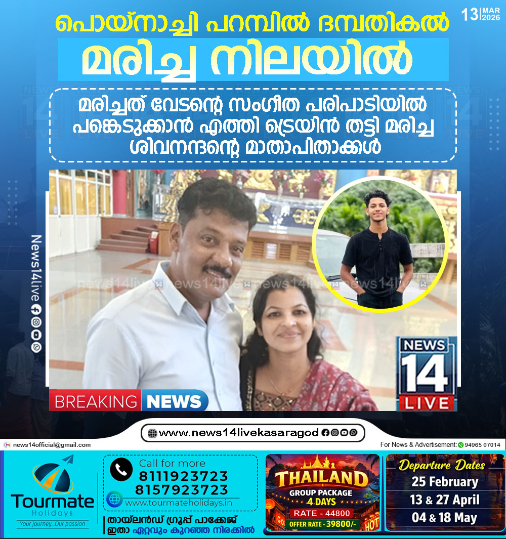 പൊയ്നാച്ചി പറമ്പില്‍ ദമ്പതികല്‍ മരിച്ച നിലയില്‍;മരിച്ചത് വേടന്റെ സംഗീത പരിപാടിയില്‍ പങ്കെടുക്കാന്‍ എത്തിട്രെയിന്‍ തട്ടി മരിച്ച വിദ്യാര്‍ത്ഥിയുടെ മാതാപിതാക്കള്‍