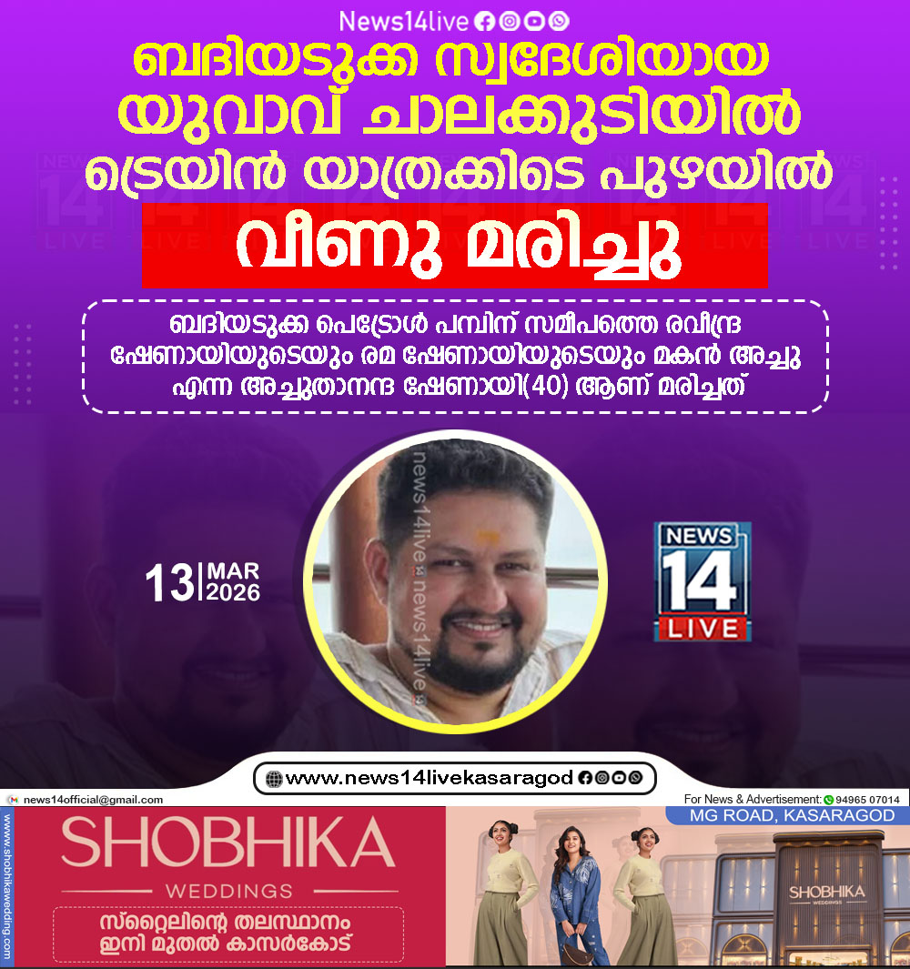 ബദിയടുക്ക സ്വദേശിയായ യുവാവ് ചാലക്കുടിയില്‍ ട്രെയിന്‍ യാത്രക്കിടെ പുഴയില്‍ വീണു മരിച്ചു