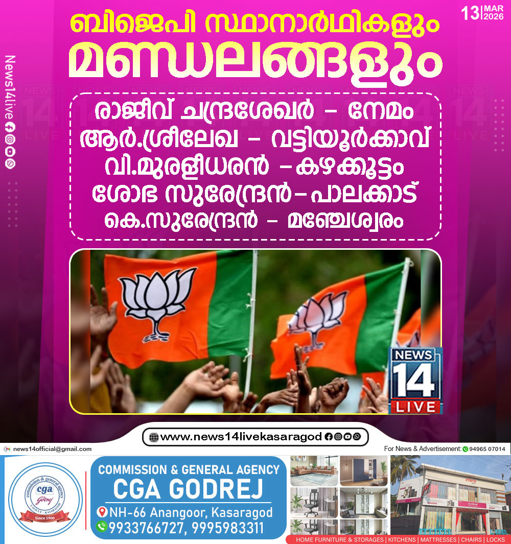 ബിജെപി സ്ഥാനാര്‍ഥികളും മണ്ഡലങ്ങളും.രാജീവ് ചന്ദ്രശേഖര്‍ – നേമം ആര്‍.ശ്രീലേഖ – വട്ടിയൂര്‍ക്കാവ് വി.മുരളീധരന്‍ -കഴക്കൂട്ടം ശോഭ സുരേന്ദ്രന്‍-പാലക്കാട്കെ.സുരേന്ദ്രന്‍ – മഞ്ചേശ്വരം