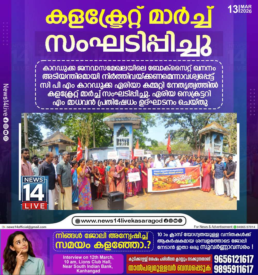 കാറഡുക്ക ജനവാസമേഖലയിലെ ബോക്‌സൈറ്റ് ഖനനം അടിയന്തിരമായി നിര്‍ത്തിവയ്ക്കണമെന്നാവശ്യപ്പെട്ട് സി പി എം കാറഡുക്ക ഏരിയാ കമ്മറ്റി നേതൃത്വത്തില്‍ കളക്ട്രേറ്റ് മാര്‍ച്ച് സംഘടിപ്പിച്ചു. ഏരിയ സെക്രട്ടറി എം മാധവന്‍…