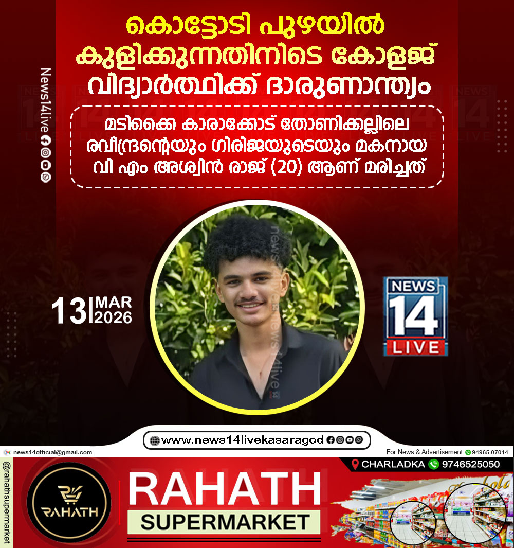 കൊട്ടോടി പുഴയില്‍ കൂട്ടുകാരോടൊപ്പം കുളിക്കാന്‍ ഇറങ്ങിയ ബിരുദ വിദ്യാര്‍ത്ഥി ദാരുണമായി മരിച്ചു. മടിക്കൈ കാരാക്കോട് തോണിക്കല്ലിലെ രവീന്ദ്രന്റെയും ഗിരിജയുടെയും മകനായ വി എം അശ്വിന്‍ രാജ് (20)…