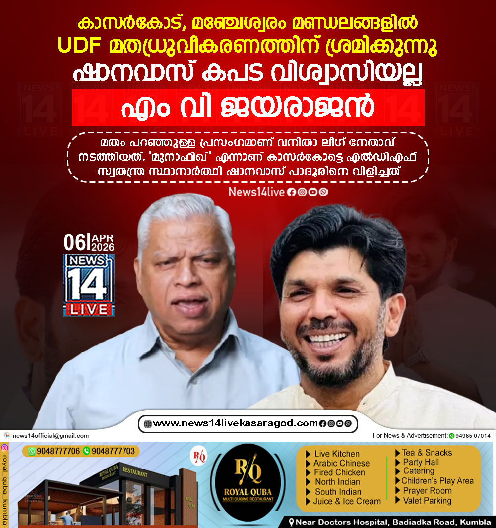 കാസര്കോട്: കാസര്കോട്, മഞ്ചേശ്വരം മണ്ഡലങ്ങളില് യുഡിഎഫ് മതധ്രുവീകരണത്തിന് ശ്രമിക്കുന്നുവെന്ന് സിപിഐഎം സംസ്ഥാന സെക്രട്ടേറിയറ്റംഗം എം വി ജയരാജന്. മതം പറഞ്ഞുള്ള പ്രസംഗമാണ് വനിതാ ലീഗ് നേതാവ് നടത്തിയത്.…