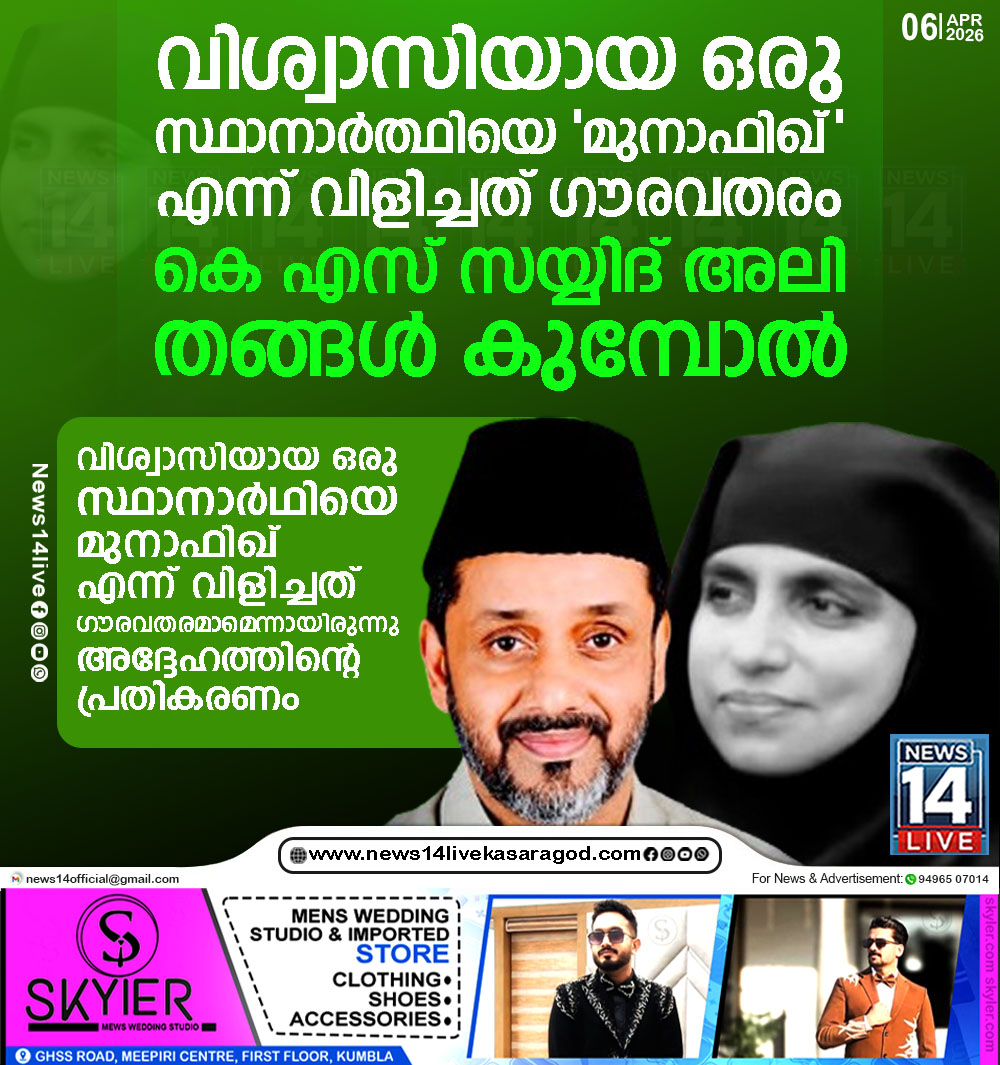 കല്പറ്റ: കാസര്കോട്ടെ എല്ഡിഎഫ് സ്വതന്ത്ര സ്ഥാനാര്ത്ഥി ഷാനവാസ് പാദൂരിനെതിരായ വനിതാ ലീഗ് നേതാവ് ആയിഷാ ഫര്സാനയുടെ ‘മുനാഫിഖ്’ പരാമര്ശത്തിനെതിരെ വിമര്ശനവുമായി കെ എസ് സയ്യിദ് അലി തങ്ങള്…