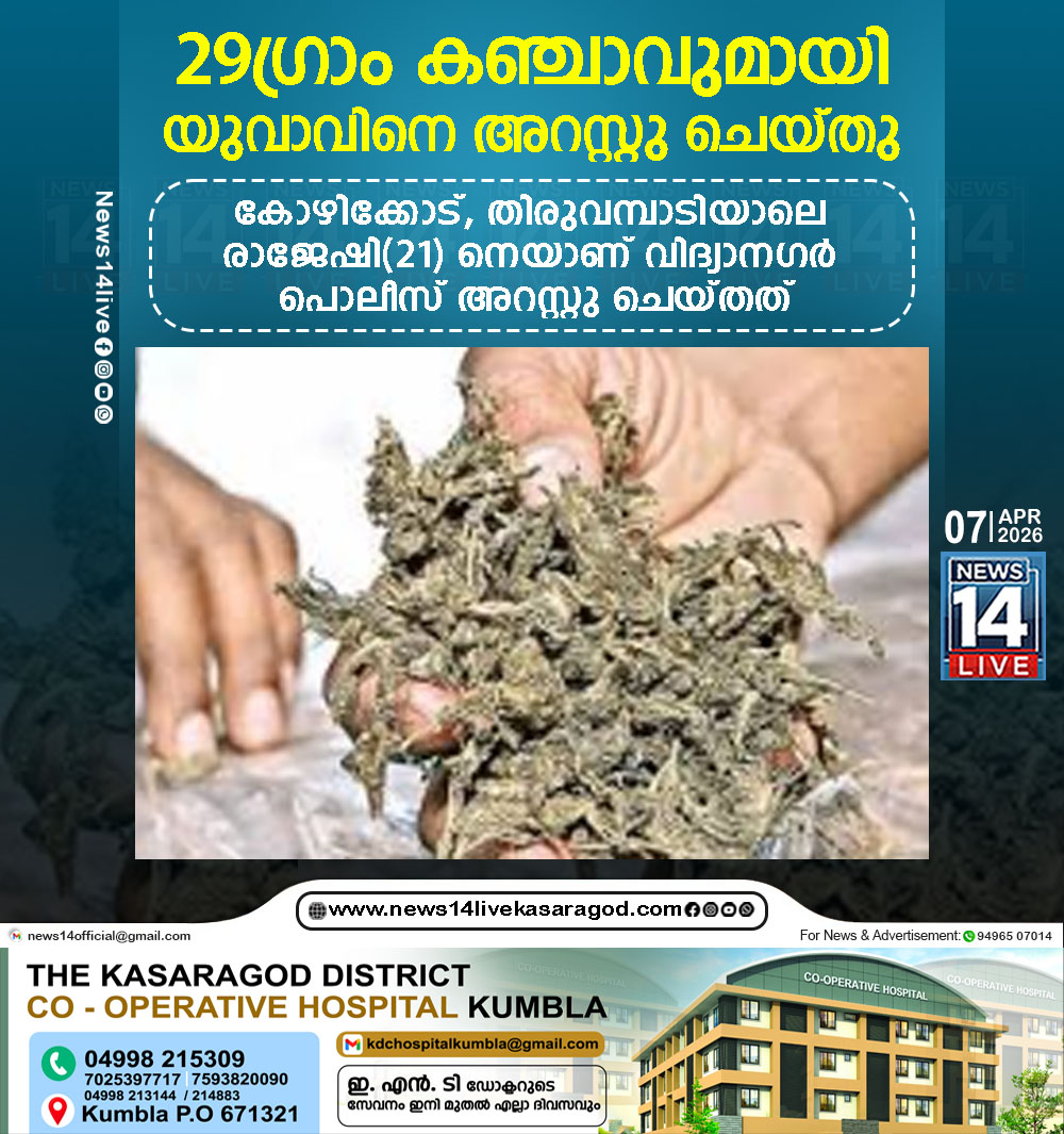 കാസര്കോട്: 29ഗ്രാം കഞ്ചാവുമായി യുവാവിനെ പൊലീസ് അറസ്റ്റു ചെയ്തു. കോഴിക്കോട്, തിരുവമ്പാടിയാലെ രാജേഷി(21) നെയാണ് വിദ്യാനഗര് പൊലീസ് അറസ്റ്റു ചെയ്തത്. ഇയാളെ ബി.എന് എസ് നോട്ടീസ് നല്കി…