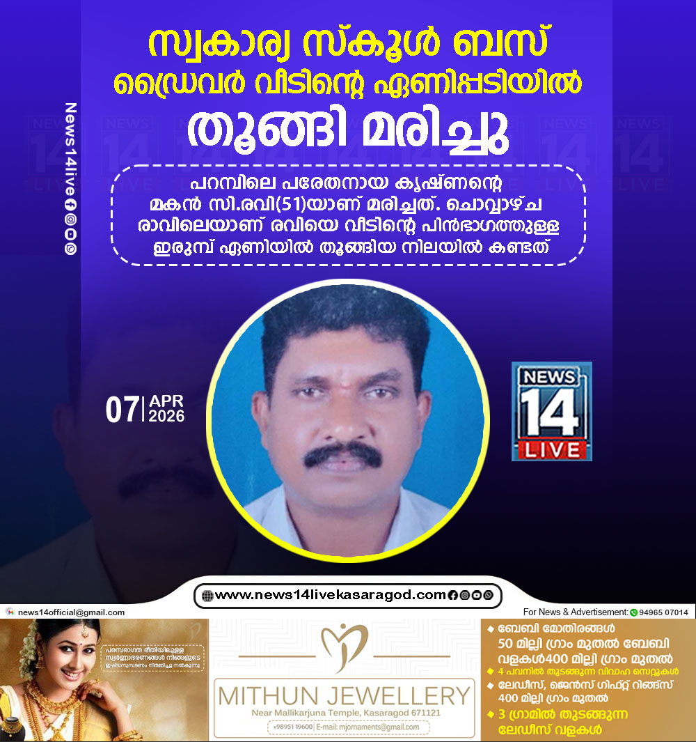 കാസര്കോട്: പൊയിനാച്ചി, പറമ്പയില് സ്വകാര്യ സ്കൂള് ബസ് ഡ്രൈവര് വീടിന്റെ ഏണിപ്പടിയില് തൂങ്ങി മരിച്ചു. പറമ്പിലെ പരേതനായ കൃഷ്ണന്റെ മകന് സി.രവി(51)യാണ് മരിച്ചത്. ചൊവ്വാഴ്ച രാവിലെയാണ് രവിയെ…