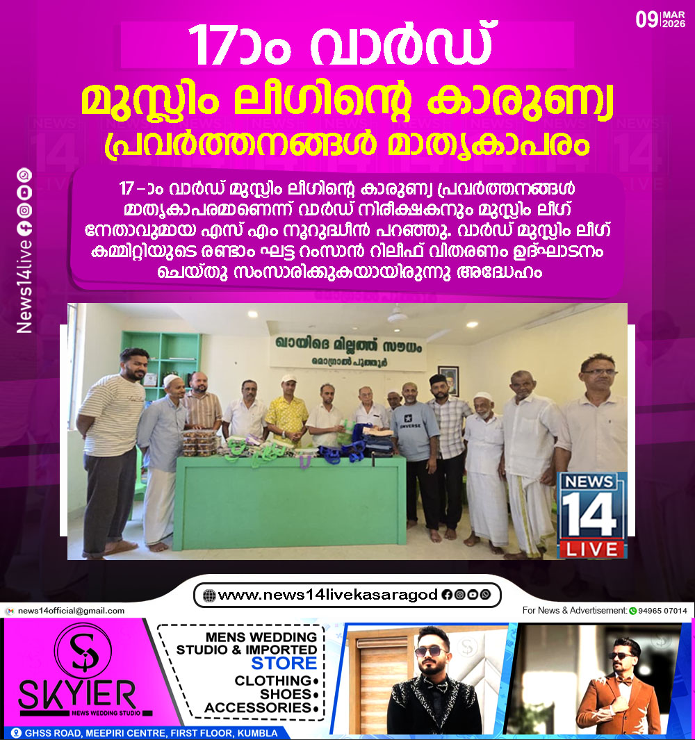 മൊഗ്രാല് പുത്തൂര് :17-ാം വാര്ഡ് മുസ്ലിം ലീഗിന്റെ കാരുണ്യ പ്രവര്ത്തനങ്ങള് മാതൃകാപരമാണെന്ന് വാര്ഡ് നിരീക്ഷകനും മുസ്ലിം ലീഗ് നേതാവുമായ എസ് എം നൂറുദ്ധീന് പറഞ്ഞു.വാര്ഡ് മുസ്ലിം ലീഗ്…