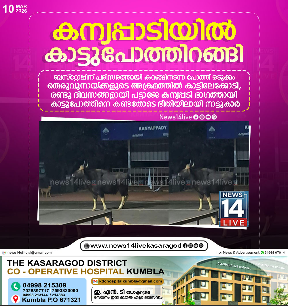 കാസർകോട്: കുമ്പള-മുള്ളേരിയ കെഎസ്ടിപി റോഡിലെ കന്യപ്പാടിയിൽ കൂറ്റൻ കാട്ടുപോത്തിറങ്ങി. തിങ്കളാഴ്ച രാത്രി 12 മണിയോടെയാണ് കാട്ടുപോത്ത് എത്തിയത്. ഞായറാഴ്ച പകൽ പട്ടാജേ ഭാഗത്ത് കറങ്ങി നടന്ന പോത്ത്…