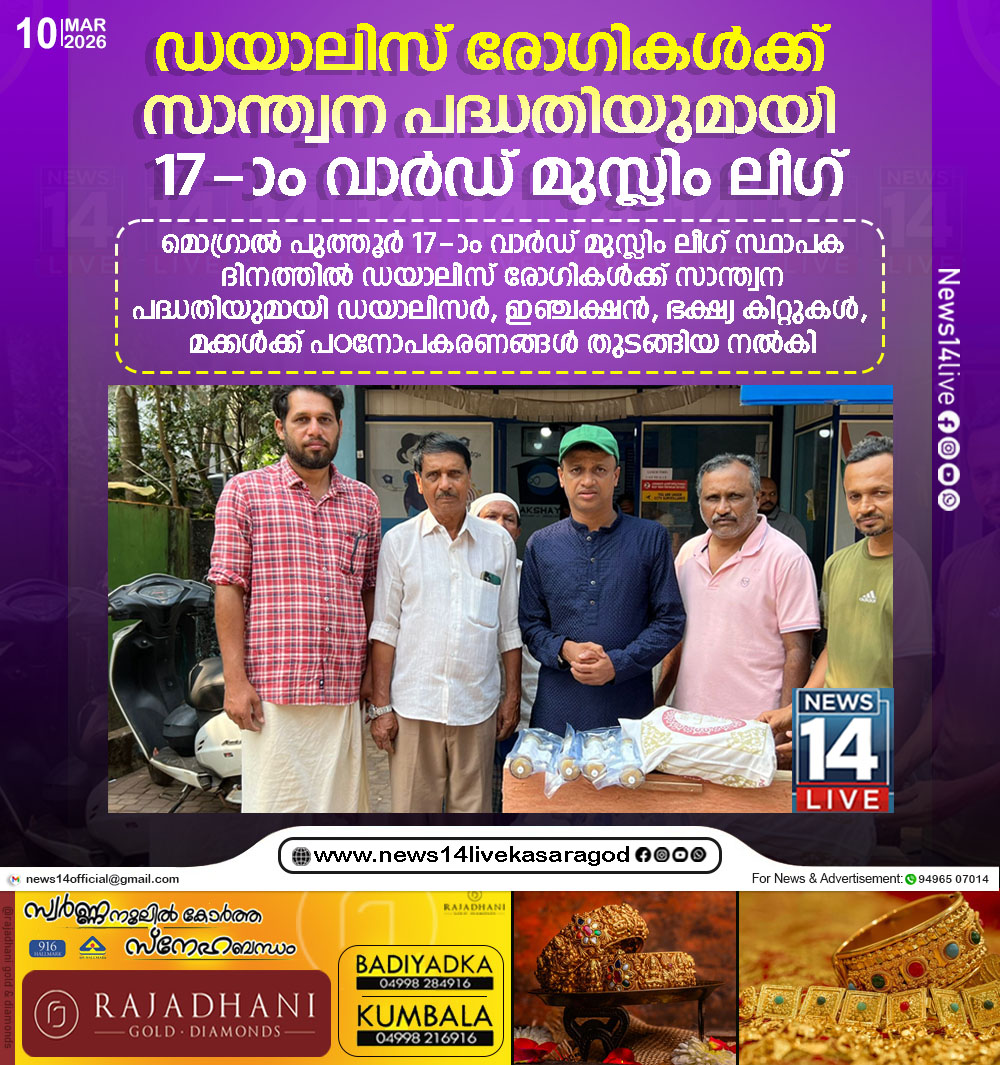 മൊഗ്രാല്പുത്തൂര്: മുസ്ലിം ലീഗ് സ്ഥാപക ദിനം ഡയാലിസ് രോഗികള്ക്ക് സാന്ത്വന പദ്ധതിയുമായി17-ാം വാര്ഡ് മുസ്ലിം ലീഗ് കമ്മിറ്റി.വാര്ഡിലെ ഡയാലിസ് രോഗികള്ക്ക് ഡയാലിസര്, ഇഞ്ചക്ഷന്, ഭക്ഷ്യ കിറ്റുകള്, മക്കള്ക്ക്…
