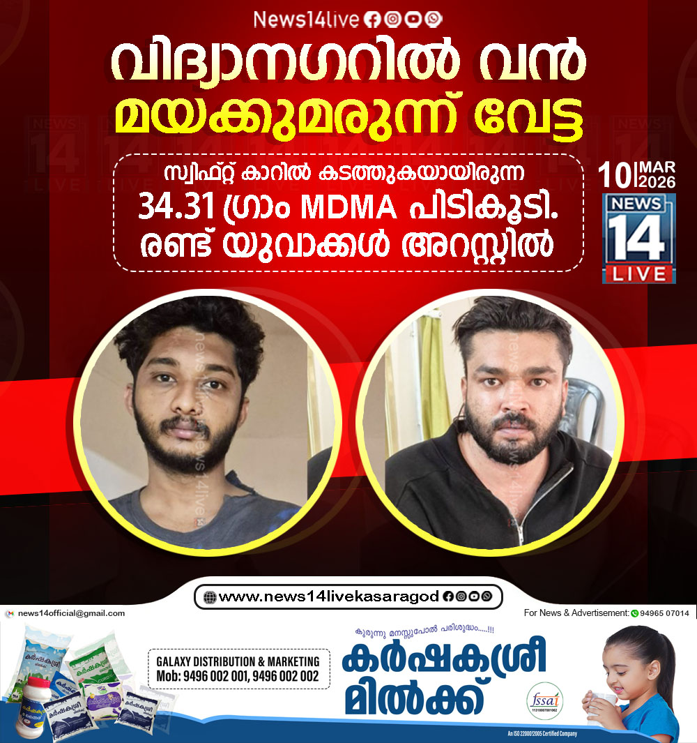 കാസറഗോഡ്: വിദ്യാനഗര് പോലീസ് സ്റ്റേഷന് പരിധിയില് നടത്തിയ മിന്നല് പരിശോധനയില് മാരക മയക്കുമരുന്നായ MDMA-യുമായി രണ്ട് യുവാക്കള് പിടിയിലായി. മുട്ടത്തൊടി ആതിഫ് മന്സിലില് മുഹമ്മദ് അന്ഷീദ് (26),…