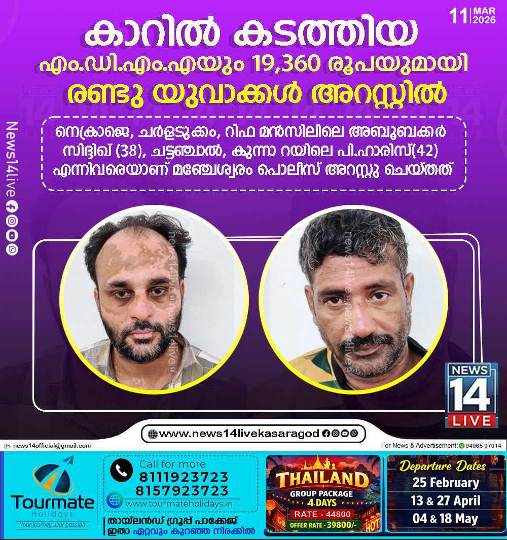 നെക്രാജെ, ചര്ളടുക്കം, റിഫ മന്സിലിലെ അബൂബക്കര് സിദ്ദിഖ് (38), ചട്ടഞ്ചാല്, കുന്നാ റയിലെ പി.ഹാരിസ്(42) എന്നിവരെയാണ് മഞ്ചേശ്വരം പൊലീസ് അറസ്റ്റു ചെയ്തത്.