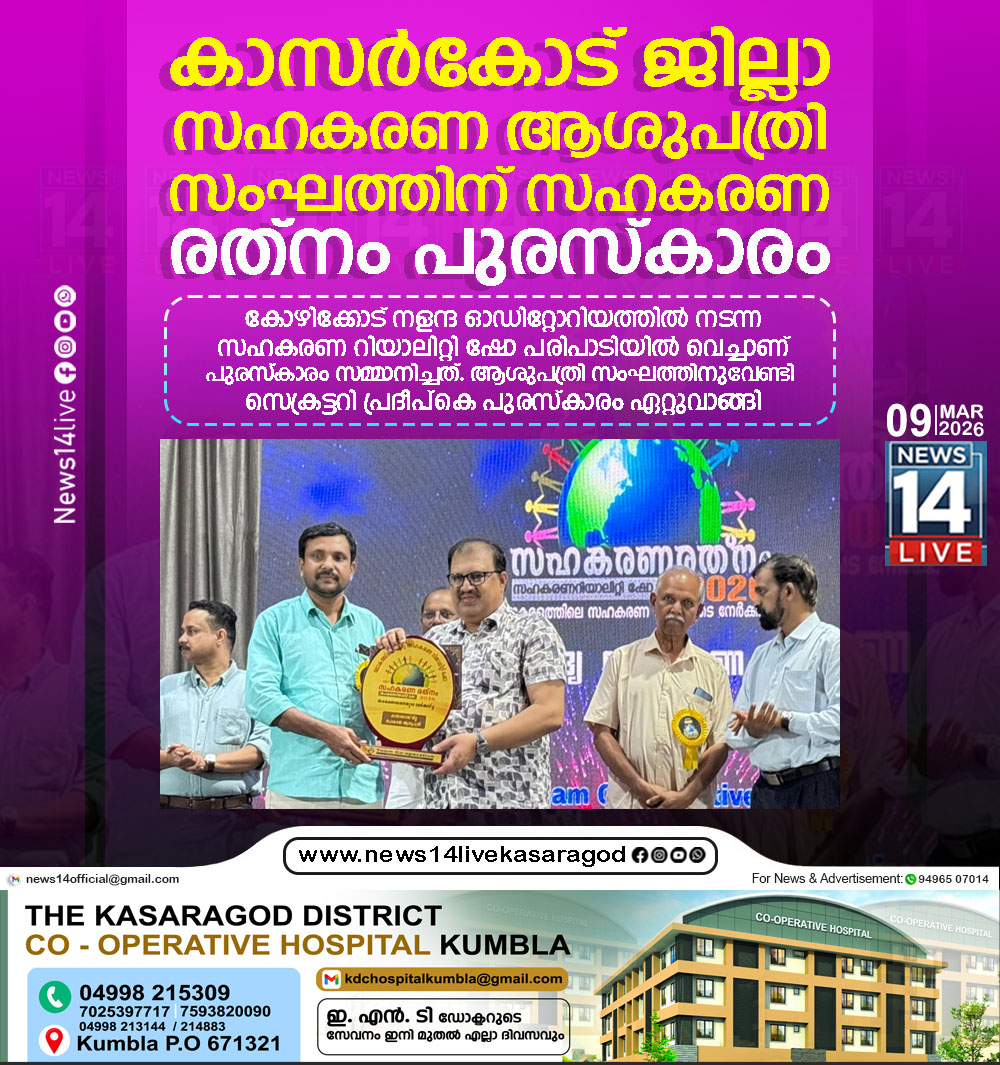 തൃശൂര്‍ ആസ്ഥാനമായി പ്രവര്‍ത്തിക്കുന്ന ടീം കോ ഓപ്പറേറ്റീവിന്റെ സഹകരണ രത്‌നം 2026 പുരസ്‌കാരം കാസര്‍കോട് ജില്ലാ സഹകരണ ആശുപത്രി സംഘത്തിന്. സംഘത്തിന്റെ സ്തുത്യര്‍ഹമായ പ്രവര്‍ത്തനം, നൂതന സഹകരണ…