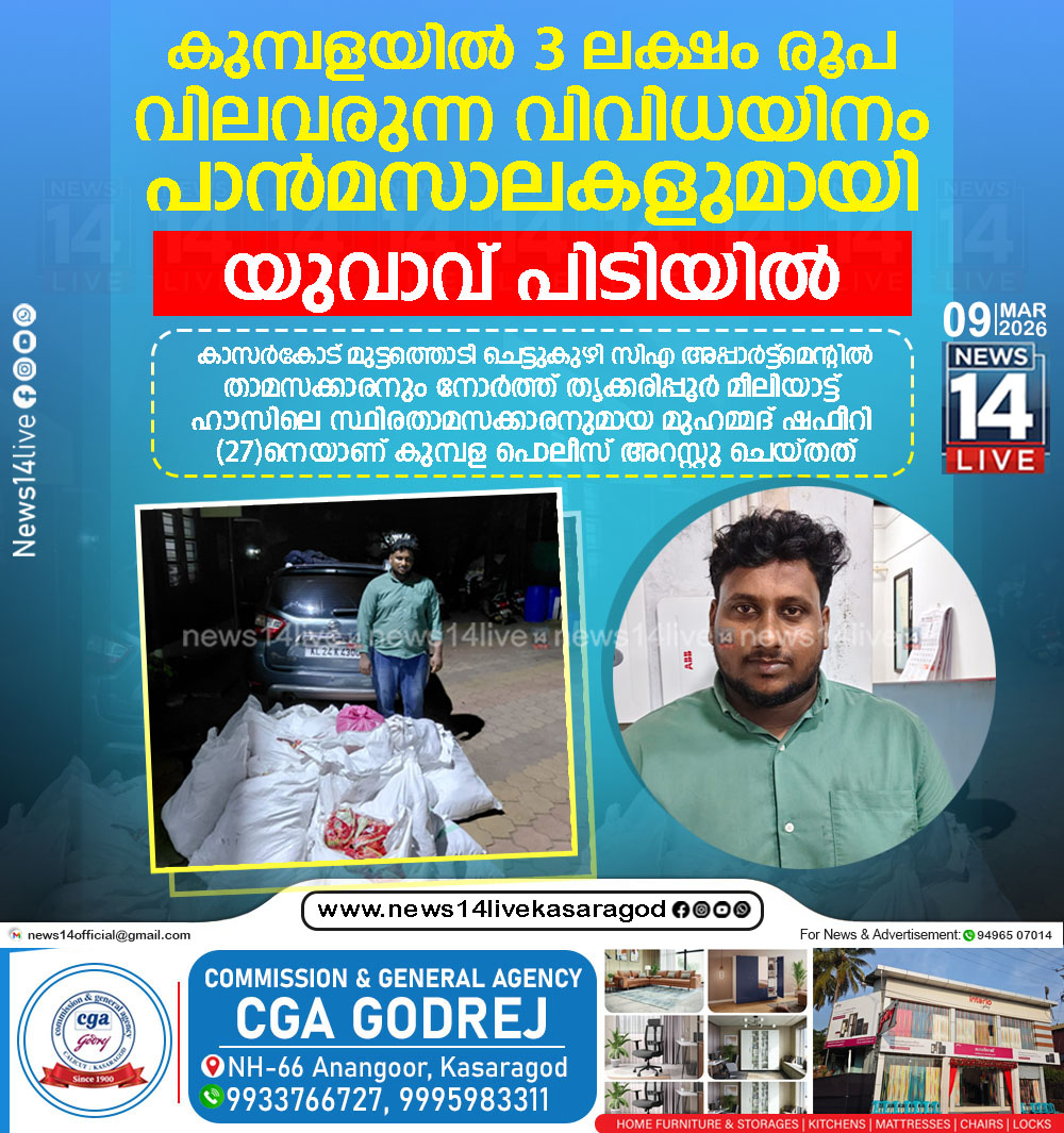 കുമ്പളയില്‍ 3 ലക്ഷം രൂപ വിലവരുന്ന വിവിധയിനം പാന്‍മസാലകളുമായി യുവാവ് പിടിയില്‍. തൃക്കരിപ്പൂര്‍ സ്വദേശി ഷഫീറാണ് പിടിയിലായത്