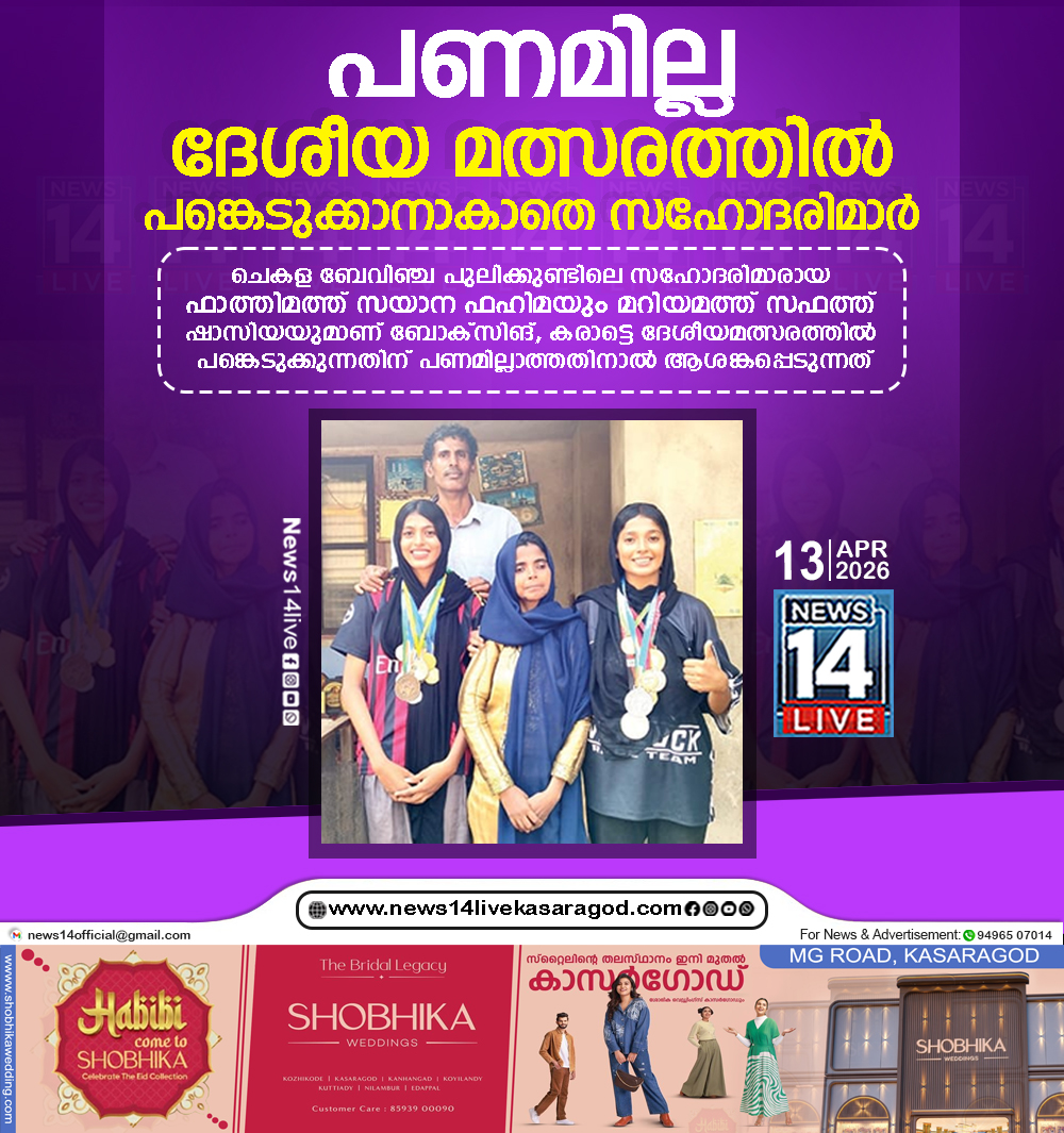 ചെര്‍ക്കള യാത്രച്ചെലവുകള്‍ക്ക് പണമില്ലാത്തതിനാല്‍ ദേശീയ ചാമ്പ്യന്‍ഷിപ്പില്‍ പങ്കെടുക്കാന്‍ വഴി തെളിയാതെ സഹോദരിമാര്‍. ചെകള ബേവിഞ്ച പുലിക്കുണ്ടിലെ സഹോദരിമാരായ ഫാത്തിമത്ത് സയാന ഫഹിമയും മറിയമത്ത് സഫത്ത് ഷാസിയയുമാണ് ബോക്‌സിങ്,…