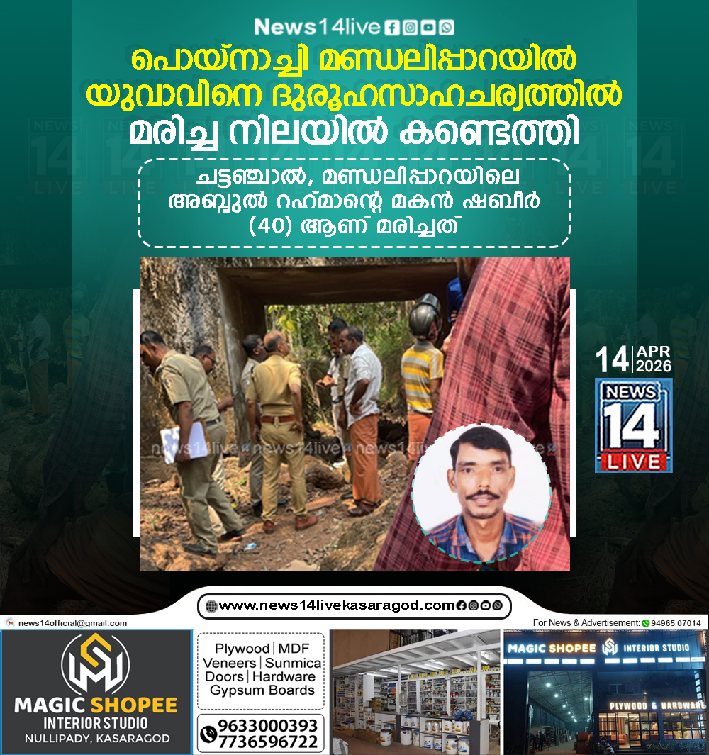 പൊയ്‌നാച്ചി മണ്ഡലിപ്പാറയില്‍ യുവാവിനെ ദുരൂഹസാഹചര്യത്തില്‍ മരിച്ച നിലയില്‍ കണ്ടെത്തി