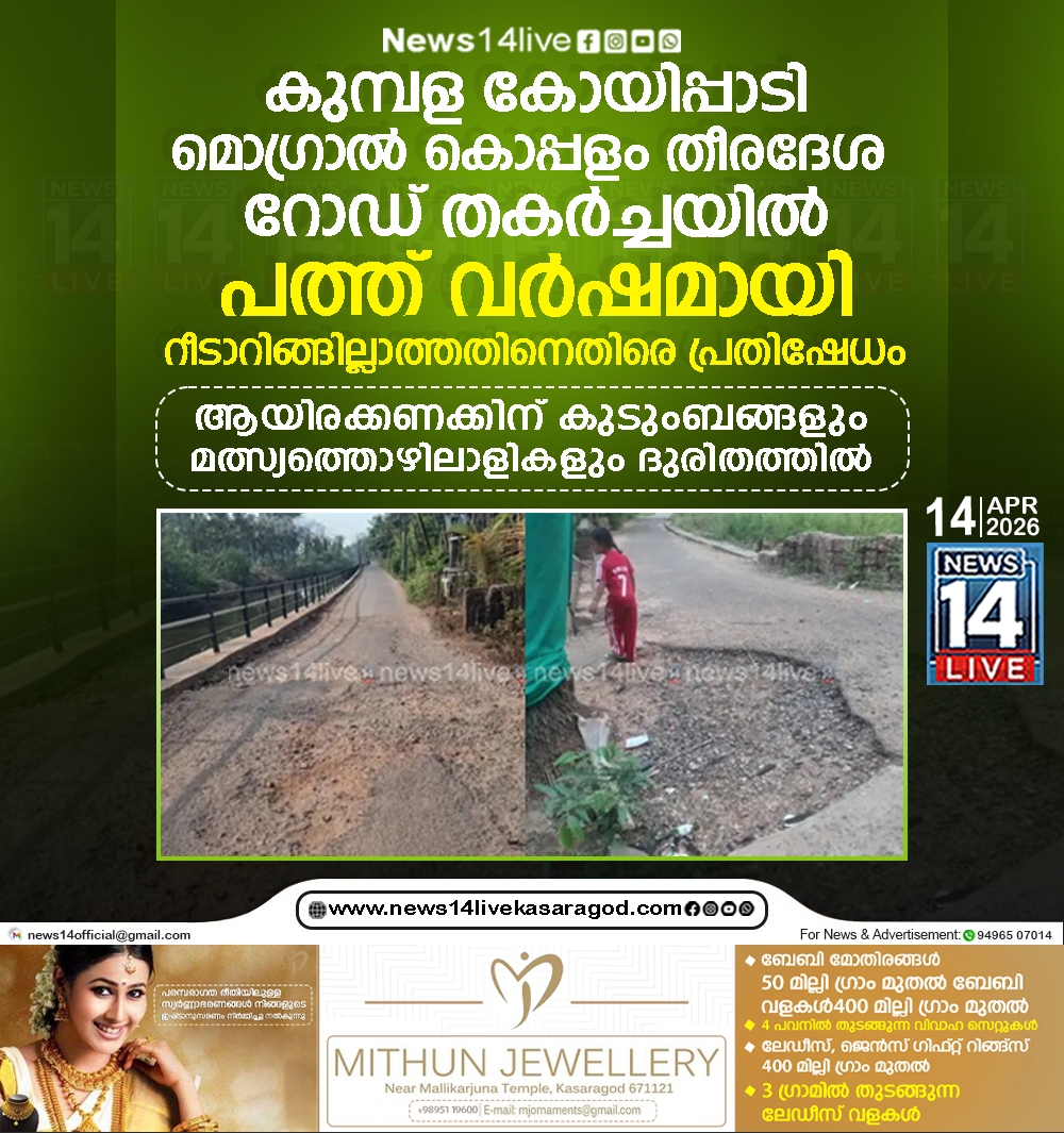 കുമ്പള കോയിപ്പാടി-മൊഗ്രാല്‍ കൊപ്പളം തീരദേശ റോഡ് തകര്‍ച്ചയില്‍