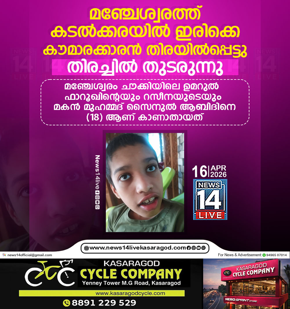 മാതാപിതാക്കള്‍ക്കൊപ്പം കടല്‍ക്കരയില്‍ ഇരിക്കുകയായിരുന്ന കൗമാരക്കാരന്‍ തിരയില്‍പ്പെട്ട് കാണാതായി. മഞ്ചേശ്വരം ചൗക്കിയിലെ ഉമറുല്‍ ഫാറൂഖിന്റെയും റസീനയുടെയും മകന്‍ മുഹമ്മദ് സൈനുല്‍ ആബിദിനെ (18) ആണ് കാണാതായത്. ബുധനാഴ്ച വൈകിട്ട്…