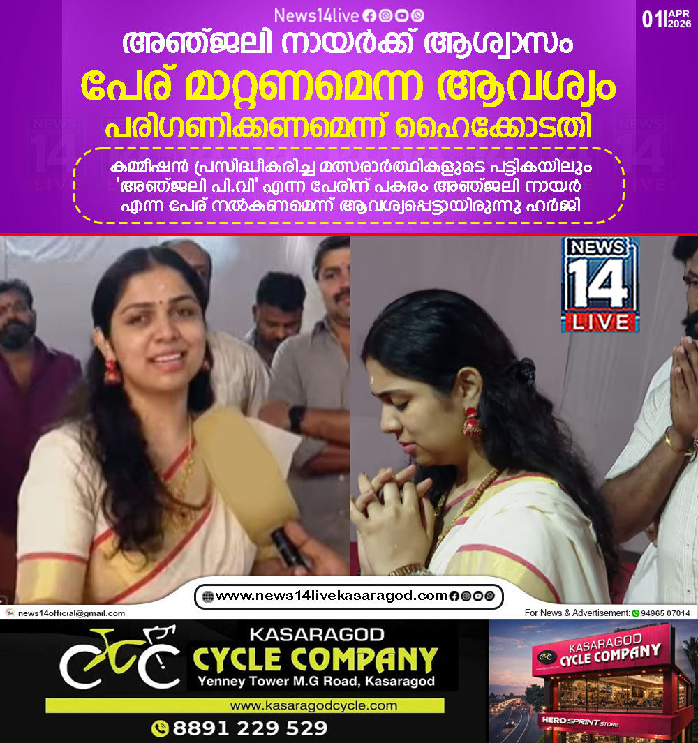 കൊച്ചി: ഇവിഎമ്മിലെ നിലവിലെ പേര് മാറ്റി നല്കണമെന്ന് ആവശ്യപ്പെട്ട് തൃപ്പൂണിത്തുറയിലെ എന്ഡിഎ സ്ഥാനാര്ത്ഥി അഞ്ജലി നായര് നല്കിയ ഹര്ജിയില് അനുകൂല നിലപാടെടുത്ത് ഹൈക്കോടതി. കമ്മീഷന് പ്രസിദ്ധീകരിച്ച മത്സരാര്ത്ഥികളുടെ…