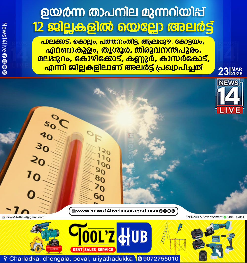 തിരുവനന്തപുരം: സംസ്ഥാനത്ത് താപനില മുന്നറിയിപ്പ് തുടരുന്നു. 12 ജില്ലകളില് യെല്ലോ അലര്ട്ട് പ്രഖ്യാപിച്ചു. പാലക്കാട്, കൊല്ലം ജില്ലകളില് 38 ഡിഗ്രി സെല്ഷ്യസ് വരെ താപനില ഉയര്ന്നേക്കാം. പത്തനംതിട്ട,…